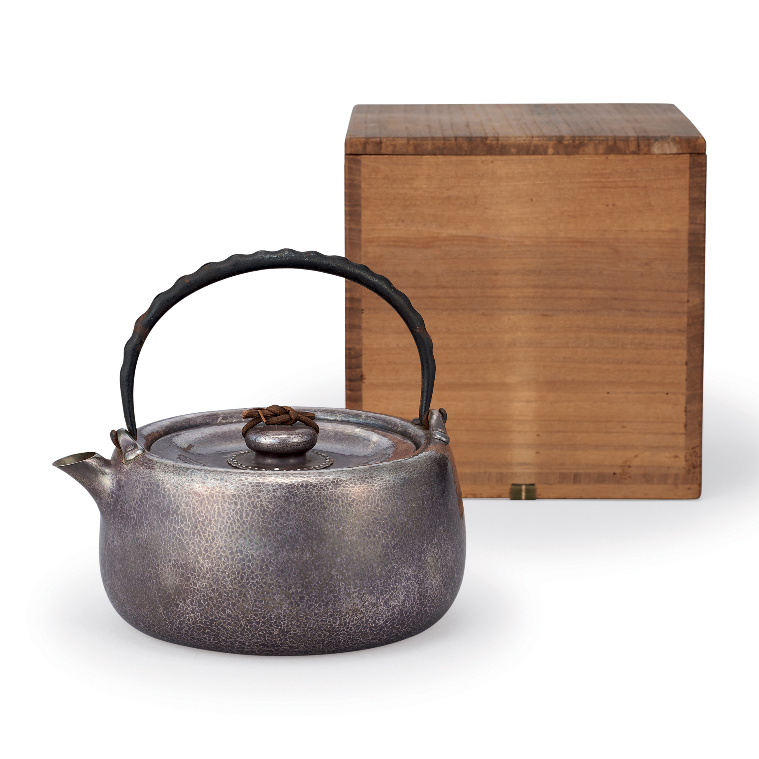 此件銀壺口打出,鐵質之豆莢提梁,與圓潤飽滿壺身形成強烈的質感對比,銀的可塑性和匠師的巧奪天工之技藝,令此壺融匯貫通,從工藝上來說是極其難得的,造型優雅,大氣古樸,曲線柔韌而又富有張力,使看似簡單的銀壺,在細節處大放光彩,展現了北村靜香金工大師之高超的制壺技藝。北村靜香(1904-1976),出生於日本岡山市錦釘,本名茂雄。是日本人間國寶即重要無形文化財保持者。尤其是口打出和一塊造技藝,每一件都是獨一無二。