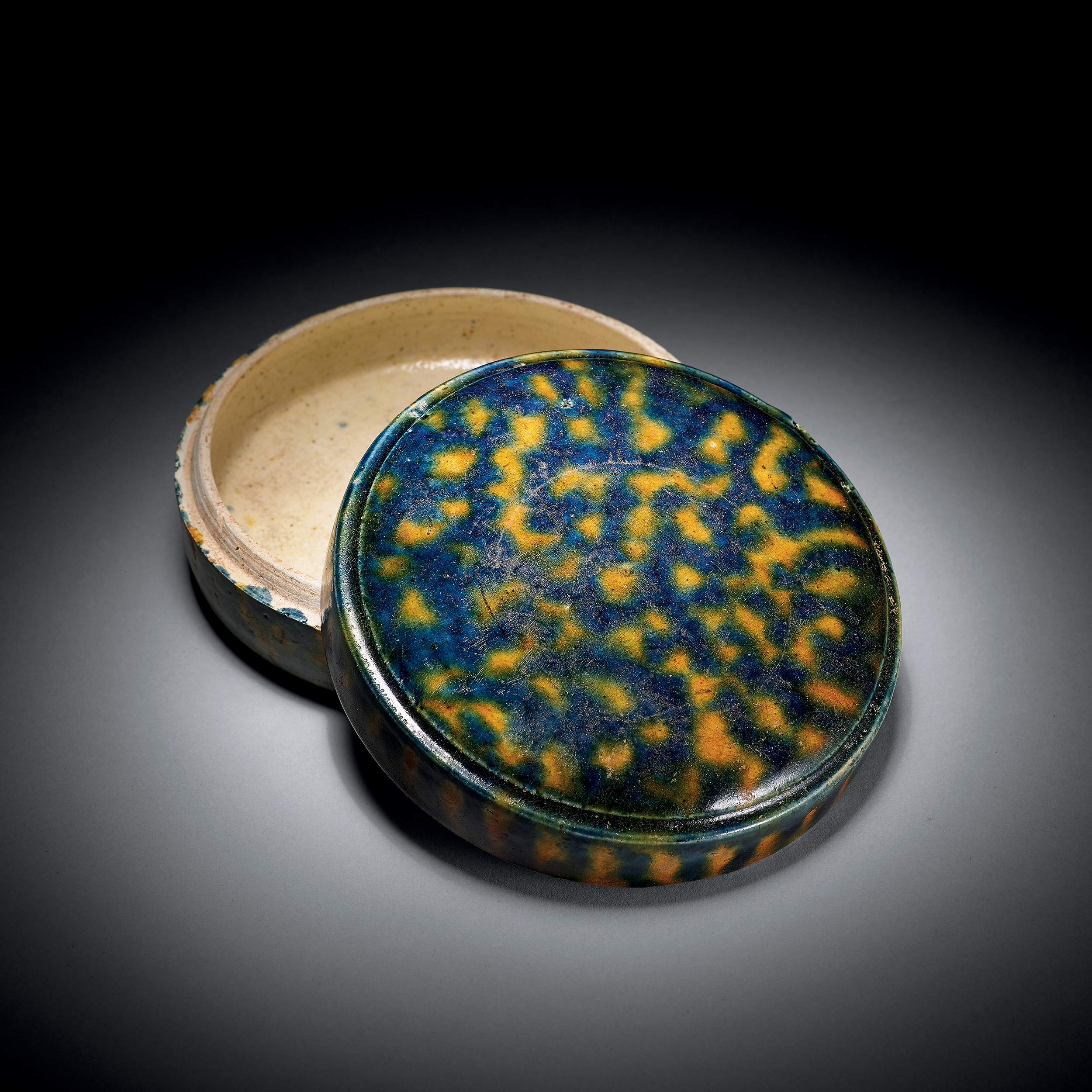 此蓋盒圓形,子母口,平底,外施三彩釉,黃藍相間,冷暖相宜,極爲特別。唐代三彩陶器極爲風行,其用途有二。據記載,早在唐初,唐三彩就被輸出國外,深受各國人民的喜愛。唐三彩外銷東運出海有兩條航線:第一條是順黃河東去,橫穿華北大平原,經渤海灣到朝鮮直達日本;第二條是經大運河,由揚州轉長江直航海外。本器做工精細,內施薄釉,當爲實用之器,極爲當初貿易商品用瓷。三彩藍釉爲钴料燒造而呈現,钴料自古即爲舶來品,頗爲珍貴,故唐三彩中藍釉三彩頗爲少見,自古便有“三彩挂藍,價值連城”的說法。整體而言,此器造型規整大氣,做工精細,色釉絢麗斑斓,為唐代蓋盒罕見之器。