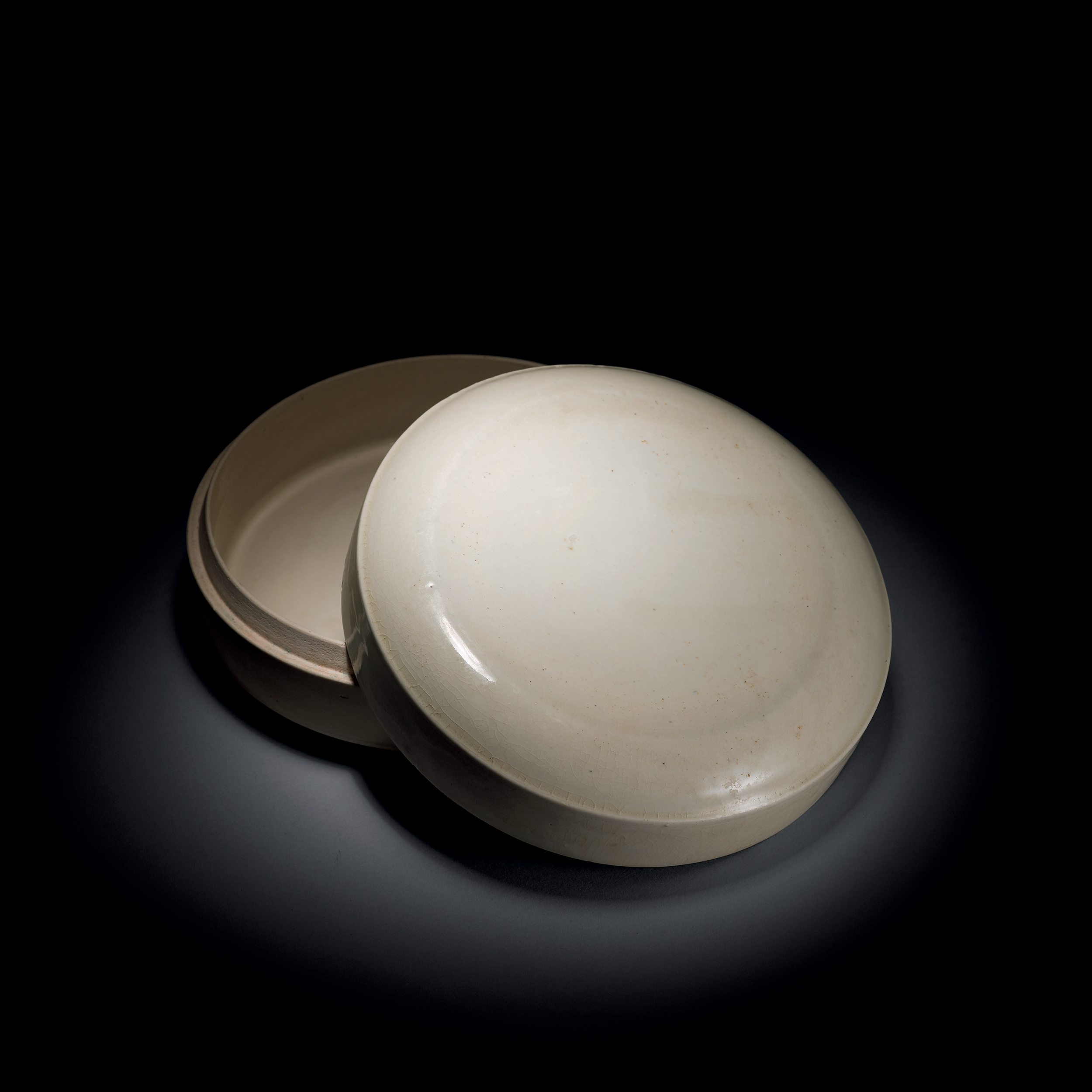 來源:香港藏家舊藏。此盒為鞏縣窯白瓷燒製,圓形,子母口,平底,通體內外施白釉,周身素面無飾。鞏縣窯位於今河南省鞏縣,故名鞏縣窯。該窯始燒于隋,盛于唐,到五代初衰退。隋代燒青瓷,唐代燒白瓷和三彩陶器等。鞏縣窯白瓷是唐代中原地區白瓷制造水平最高的,也是文獻記載河南府開元年間貢白瓷的産地。本盒器型大氣周正,做工精緻,釉色白淨純粹,邊緣稍有垂釉淚痕,為鞏縣窯白瓷之典型器物。