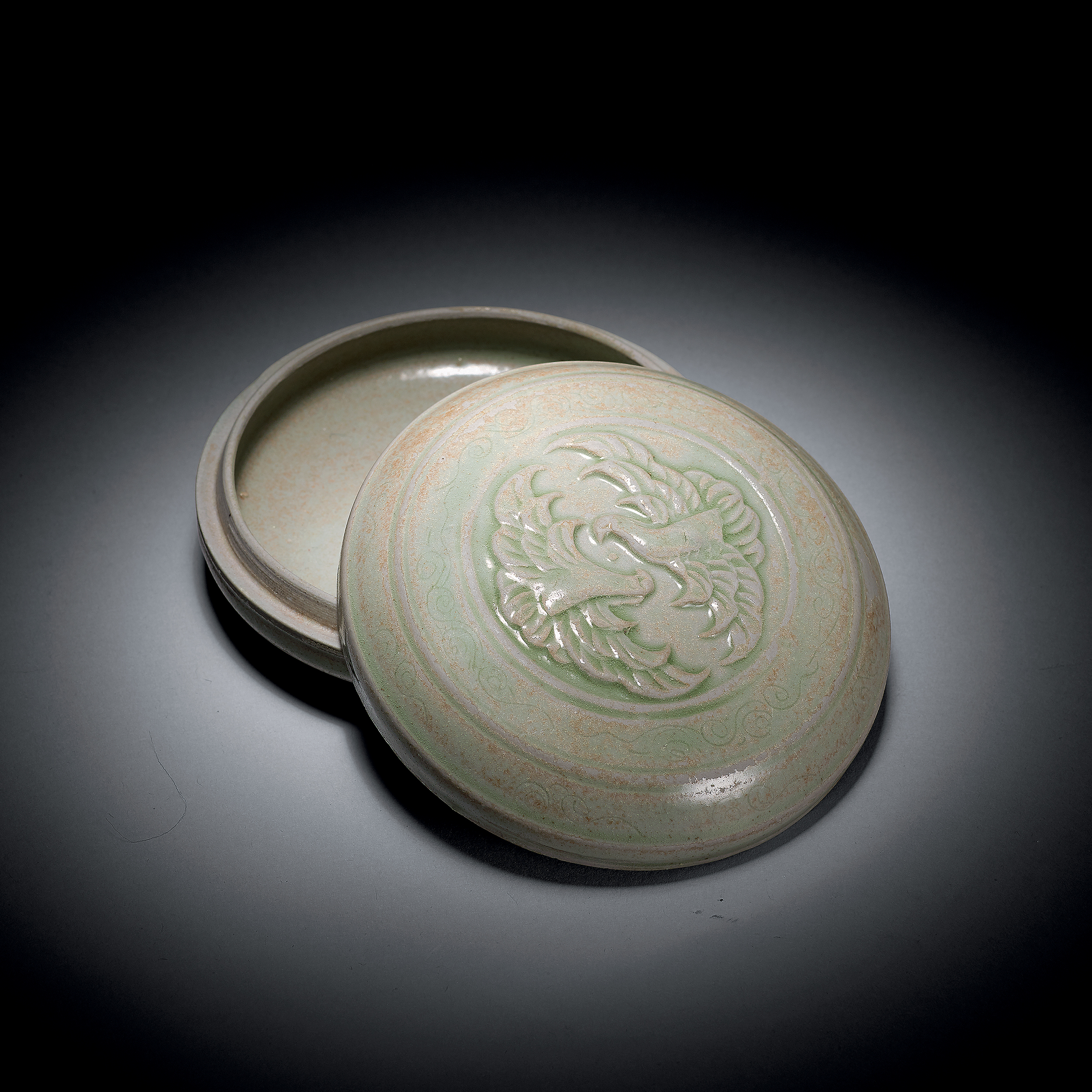 盒呈圓形,上下子母口扣合,直壁,蓋頂微微隆起,上浮刻雙鳳紋,外有三道弦紋,弦紋間陰刻卷雲紋。盒內外滿釉,胎壁雖不厚但胎質堅硬。青釉釉色之瑩潤令盒如玉似冰,淡雅至極。越窯是中國古代最著名的青瓷窯,早在唐代就設置貢窯,而宋時“置官監窯”,僅燒制宮廷用瓷。越窯之品本就是宮廷專用,且本品乃雙鳳主題,或是內宮身份最爲相符之佳麗方可使用。此盒整體釉色青翠,雕刻紋飾自然流暢,典雅大氣,為越窯蓋盒之典型器物。