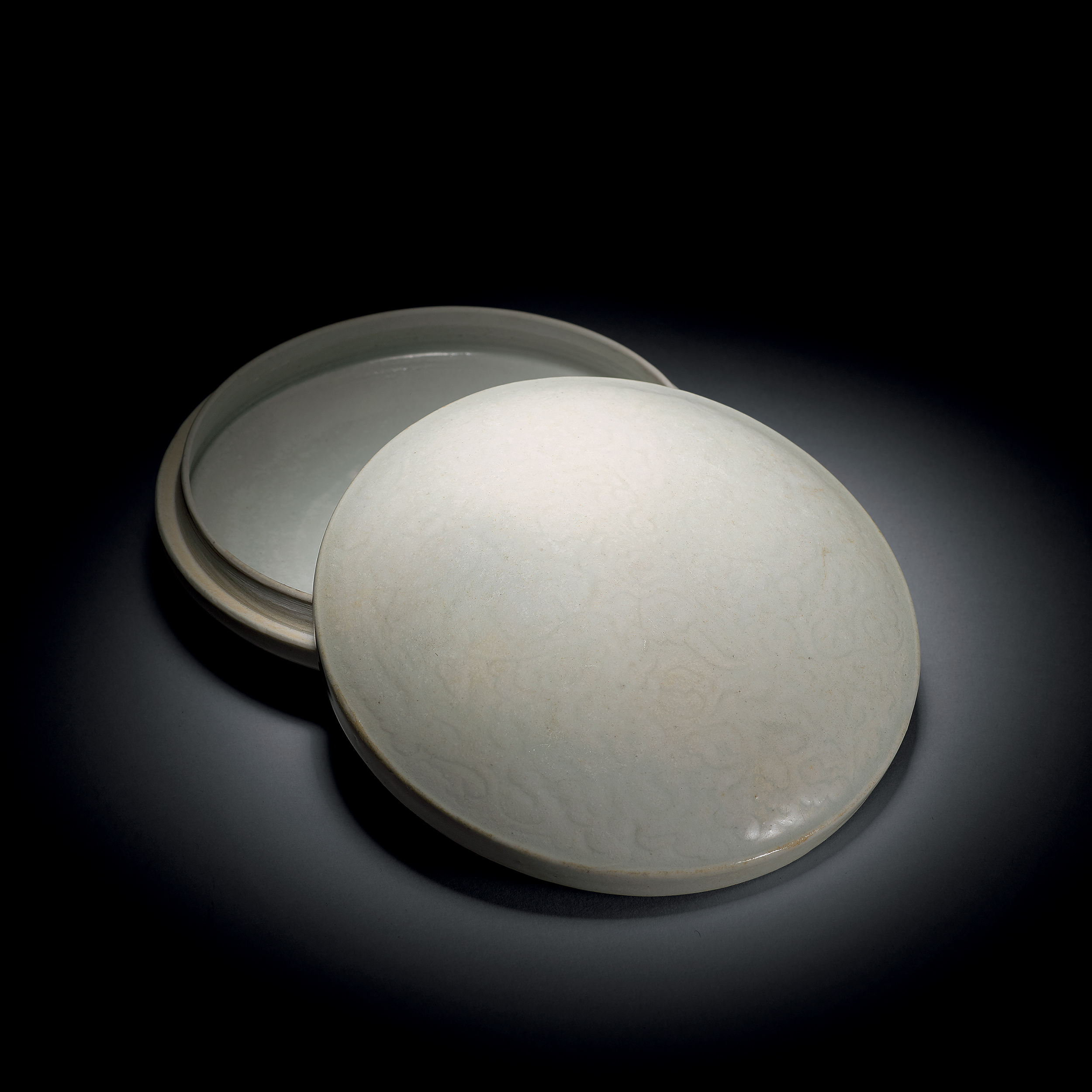 來源:英國P&F舊藏。圓形蓋盒,子母口相合,嚴絲合縫,淺圈足,足底平。盒身施青白釉,釉光瑩澈無瑕,光亮如水,蓋裏局部施釉,蓋沿無釉,盒底澀胎,見潔白細膩的胎質,結體致密,可見淘煉精細度較高。蓋面模印嬰戲圖紋,花團錦簇間孩童嬉鬧,熱鬧非凡。整器器形端正,修胎工整,釉色清新淡雅,晶瑩如玉,正所謂陶成雅器,有素肌玉骨之象,是極為珍貴的宋代傳世佳器。