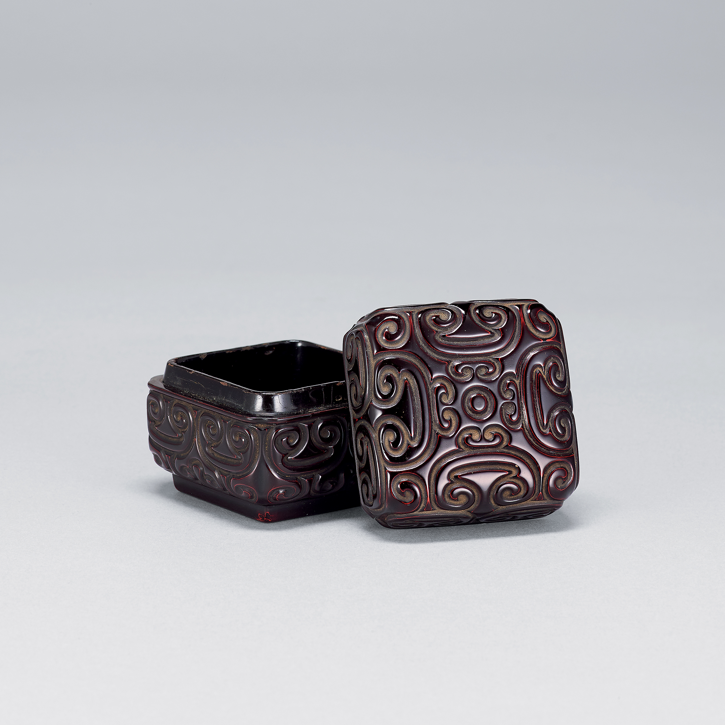 此盒木胎剔犀工藝,作四方蓋盒,子母口,深腹,淺圈足。器蓋及四面均雕如意紋,紋飾規整均勻,對稱分布,漆層紅黑疊加,厚重沈穩。整體雕刻刀法純熟,加之打磨細膩,不顯刀鋒,大有一起貫通之氣勢,堪爲剔犀器物中之經典之物。