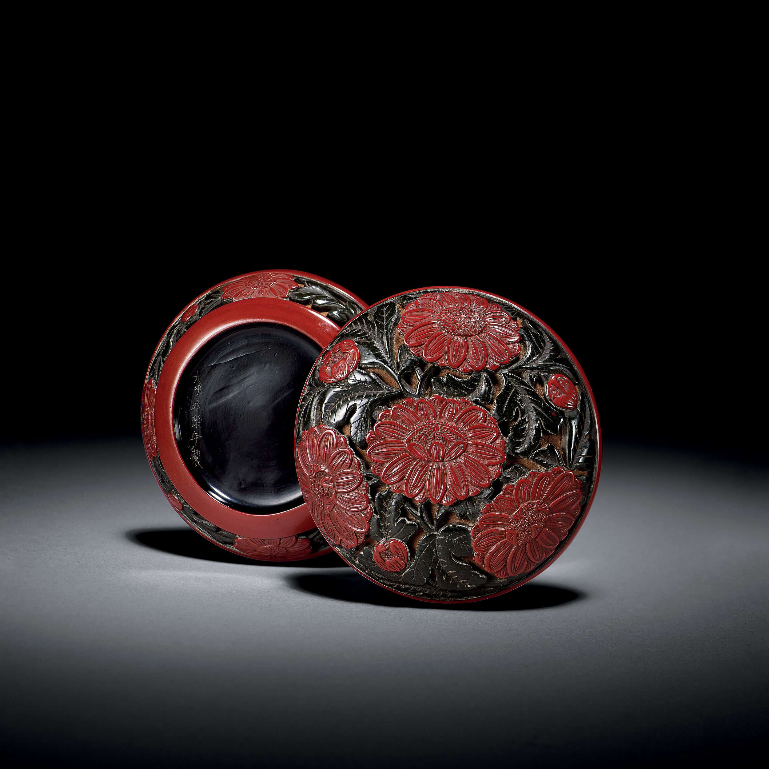 此件香盒,子母口,上施朱、綠二色彩漆剔製而成,造型小巧精緻,秀美雅緻。盒蓋之四朵盛開的菊花,色澤鮮艷,花朵碩大飽滿,花瓣層層綻放,雍容華貴,周圍以三顆含苞待放的花蕾點綴,含羞較弱,惹人喜愛。花朵周圍以深綠色漆面雕刻葉片,枝葉交疊漫卷,葉脈紋理清晰、線條流暢自然。蓋壁同樣繪製四朵盛開菊花,花朵間以花蕾相隔,與蓋面紋飾遙相呼應。蓋底髹黑漆,刻“大明永樂年製”款。整器漆色瑩潤,堆漆肥厚,形制古樸自然,雕刻精細,磨工細膩,紋飾飽滿,秀雅清麗,實為明代中期剔彩器物之經典之作,頗為少見。