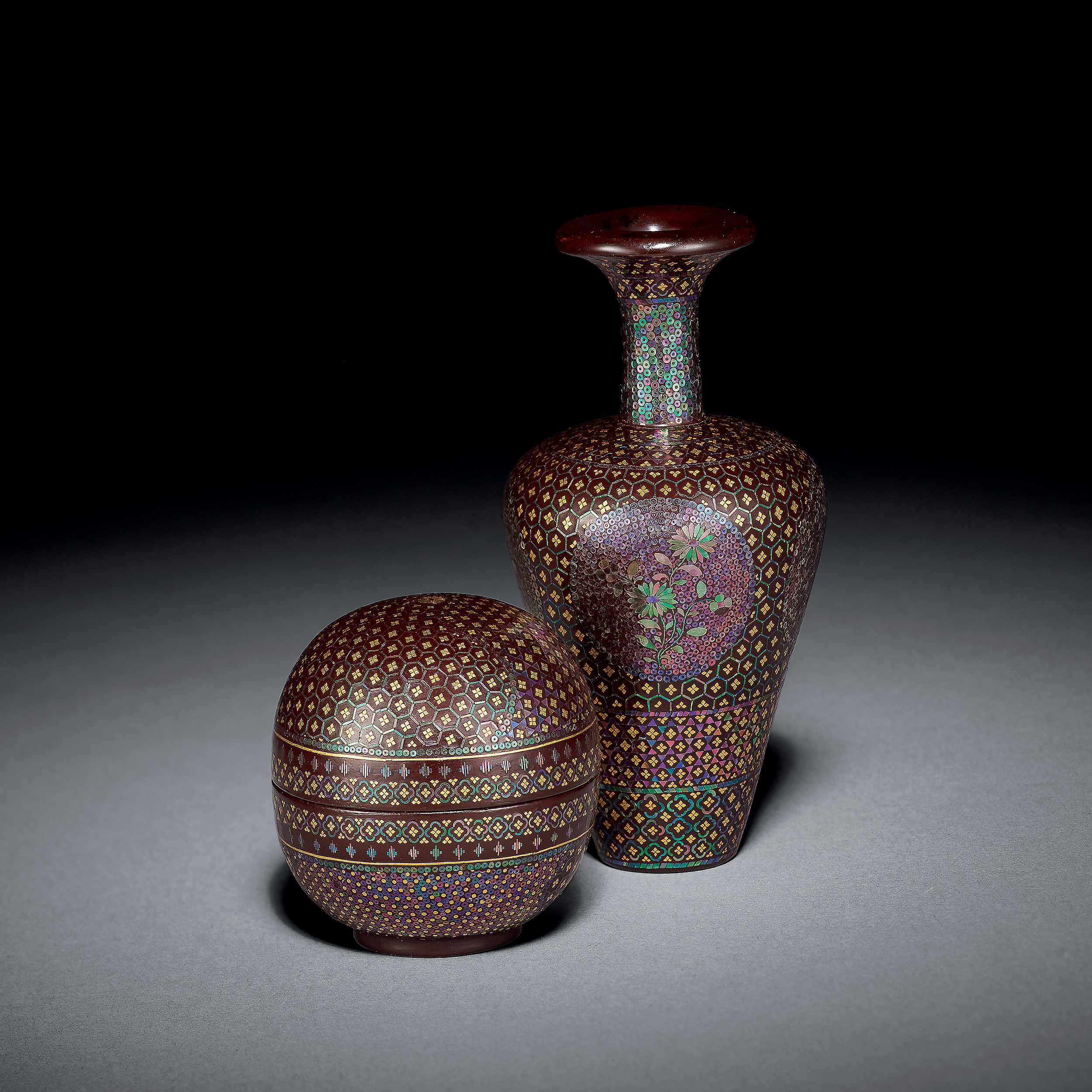 此拍品由香盒及小瓶二式組成,均為黑漆點螺鈿工藝製成。香盒渾圓,子母口,上下扣合,宛若球狀,小巧玲瓏。胎薄輕盈,表面點貼細巧的螺鈿片,多處點金,整體鑲嵌三種不同的幾何圖形,色澤燦爛多變,在光線下斑駁陸離,絢麗多彩,盒中的一朵小花為素雅的作品添上了亮麗的一筆。小瓶同樣形制嬌巧可人,紋飾古樸,素雅中透露沈穩之美,瓶身上的花卉紋與香盒中的花紋相得益彰,構思實為精妙。瓶底及盒底均落“千裏”款。
