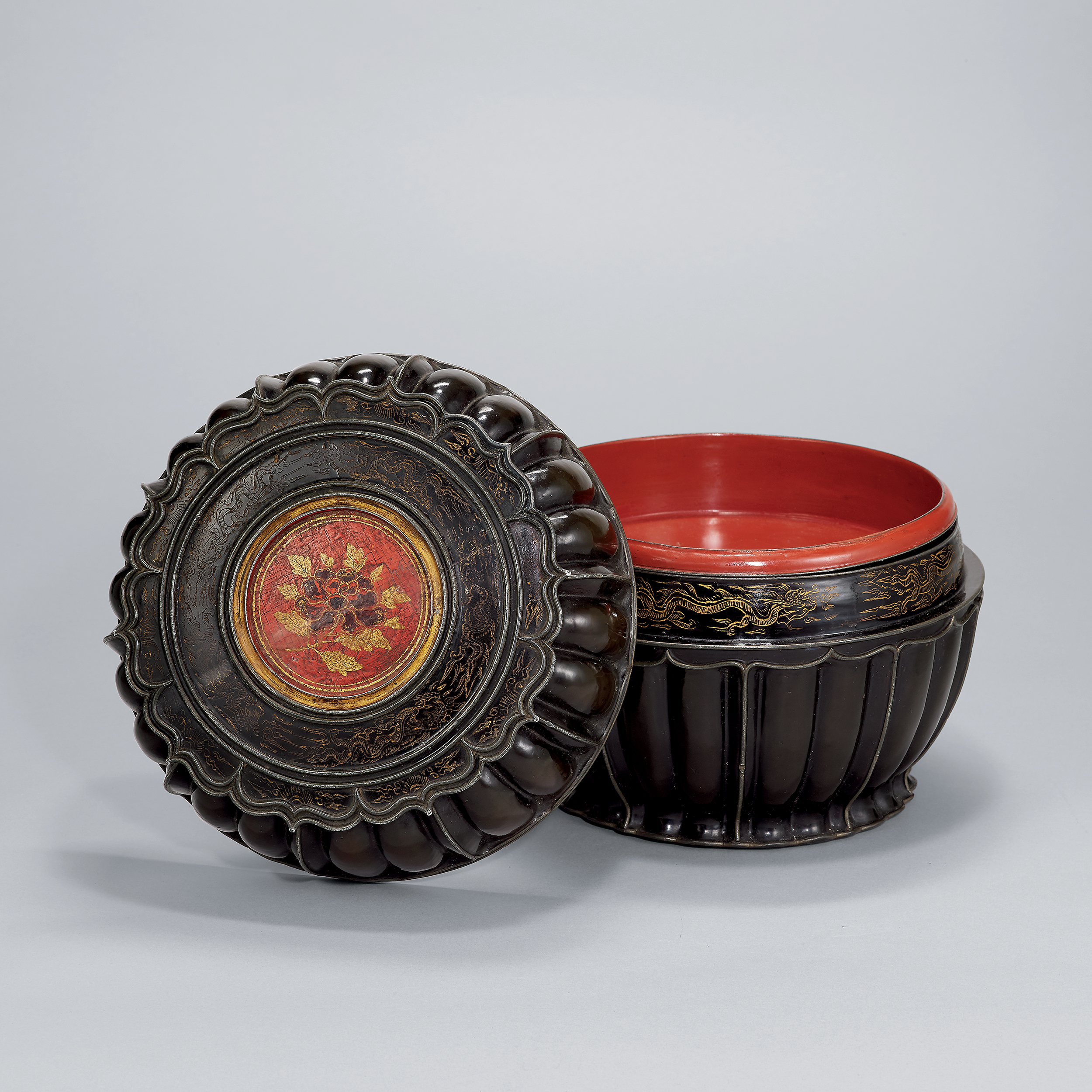 此器作寶相花綻放狀,蓋與身作對稱一體形,字母口,深腹,撇足,凹底。通體髹黑漆,漆層厚重,漆質飽滿,油潤欲滴。器內髹朱漆,呈色鮮紅豔麗。蓋面外沿呈現九瓣蓮花,向外展開,花瓣輪廓線作突起狀修飾,外壁依循蓋面蓮花瓣走向,亦雕琢蓮花瓣紋理,以扣合處爲界,分上下展開。環繞花蕊由外至內依次裝飾五周突起弦紋,突起處均做包錫條處理,既加強了表面的耐磨耗性能,又爲蓋面營造了柔和唯美的光暈效果。近花蕊的三周弦紋之間又分別填金彩,中間以紅漆戧金作牡丹紋,紋飾纖細精美,雕工精湛。外部弦紋環環相繞,此起彼伏,玹紋間與花瓣上均劃刻龍紋及花卉紋,內填金粉。口外壁一周刻雲龍紋,內以填金。整器紋飾自然走向,流暢連貫,相輔相成,環環相扣,首尾呼應,無論從哪個角度觀看都如同一朵綻放的寶相花。同時又起棱分瓣,折皺分明,透露出一種力量感。器形新穎大膽,成型難度較大,工藝更是集合漆雕,包錫,戧金等工藝于一身,為元代同類器物之佼佼者,極為難得。