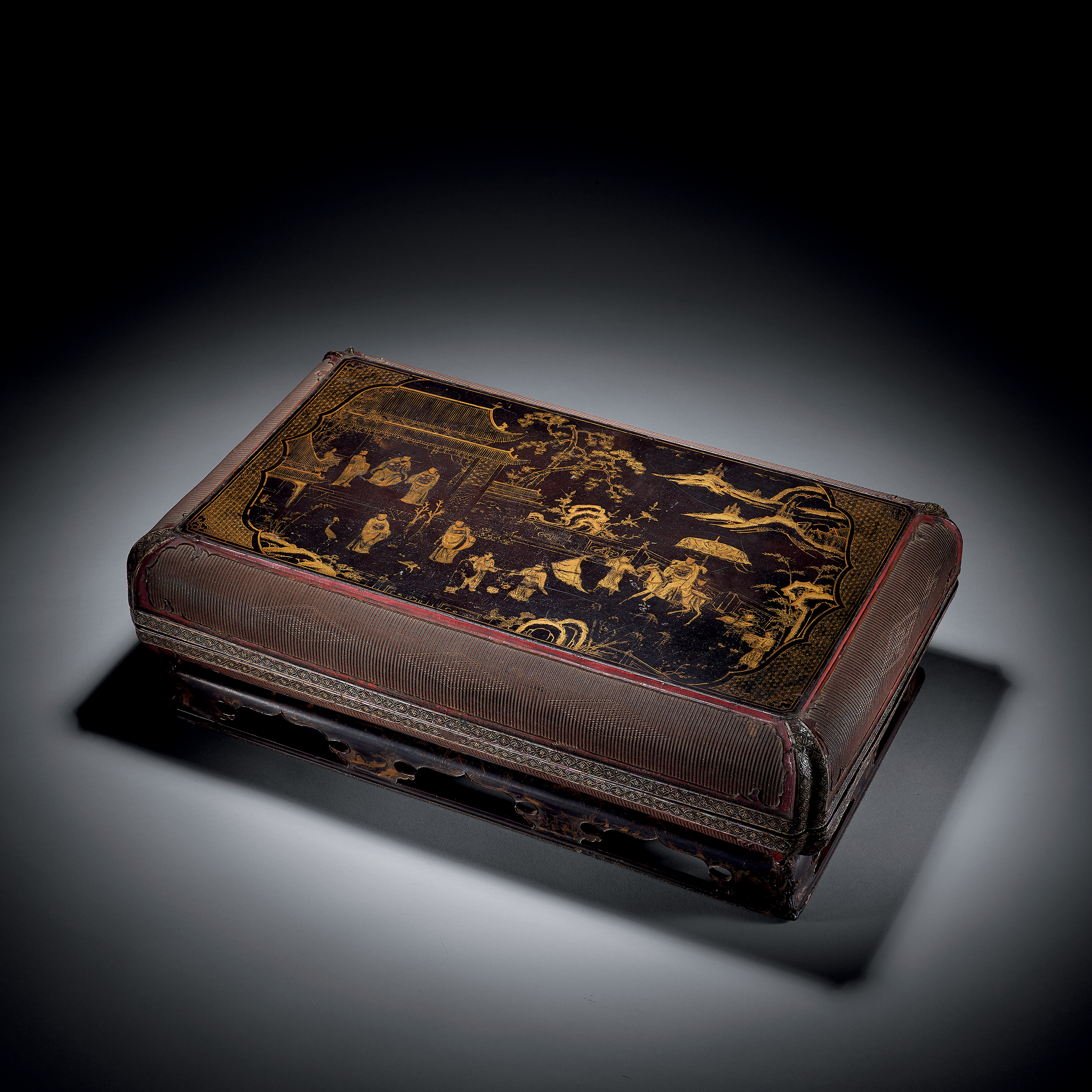 蓋盒頂面呈倭角長方形,以朱漆和褐漆分飾而繪,蓋頂面內以金彩繪完整的山水人物畫,遠處山巒起伏,近觀亭台樓閣,圍廊松柏皆描繪細緻,人物刻畫生動,或見達官貴人乘於馬背,或間官人坐於涼亭內談笑風聲,廊間隱約可見仙鶴悠閒自若行走之態,一派和諧之景。盒底圈足效仿明式家具的壺門牙子做法而製,上面亦繪有人物紋飾,底部落“崇禎四年造”金彩楷書款。整器造型別緻,古樸典雅,金彩於褐漆形成鮮明對比,為明代晚期典型之宮廷製器,同類器物見於南京博物院藏 明晚期 黑漆描金山水人物長方盒,另有中國歷史博物館藏 明晚期 戧金彩漆雲龍紋長方盒,茲可對比。