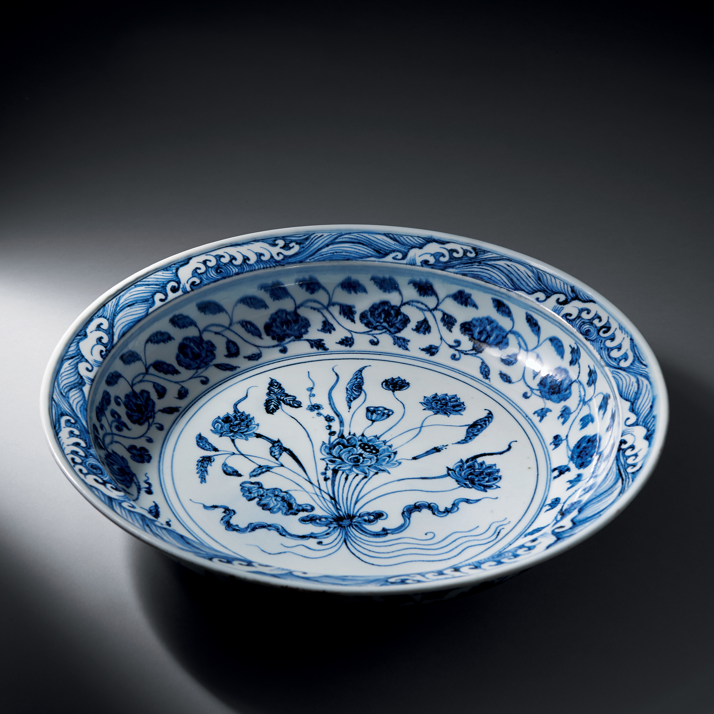 此盤弧壁,淺腹,矮圈足,器底無釉露胎,器身碩大,胎質堅硬,釉色透亮艷麗。全器用青花繪海浪紋,內外壁各繪一圈纏枝花卉紋,盤心繪蓮紋、蓮蓬,茨菰,浮萍等水生植物,以緞帶束在一起,謂之“一把蓮”。 蓮花乃中國傳統紋飾,有高潔清廉,出淤泥而不染的寓意。明代永宣時期的青花瓷,”一把蓮“為典型的裝飾圖案。根據研究,一把蓮”紋飾似爲永樂大盤所專用,1994年珠山明代禦器廠遺址永樂堆積層曾出土一件相似的作品。本器器各式花卉紋飾 布局疏密有致,畫工細膩雅致,在永樂青花艷麗卻更顯雅致的色澤映襯之下,顯得活靈活現,如同真物一般,當為傳世明永樂同類器物之珍品。台北就鴻禧美術館曾藏有一件與本器所類似的大盤,以茲參考。