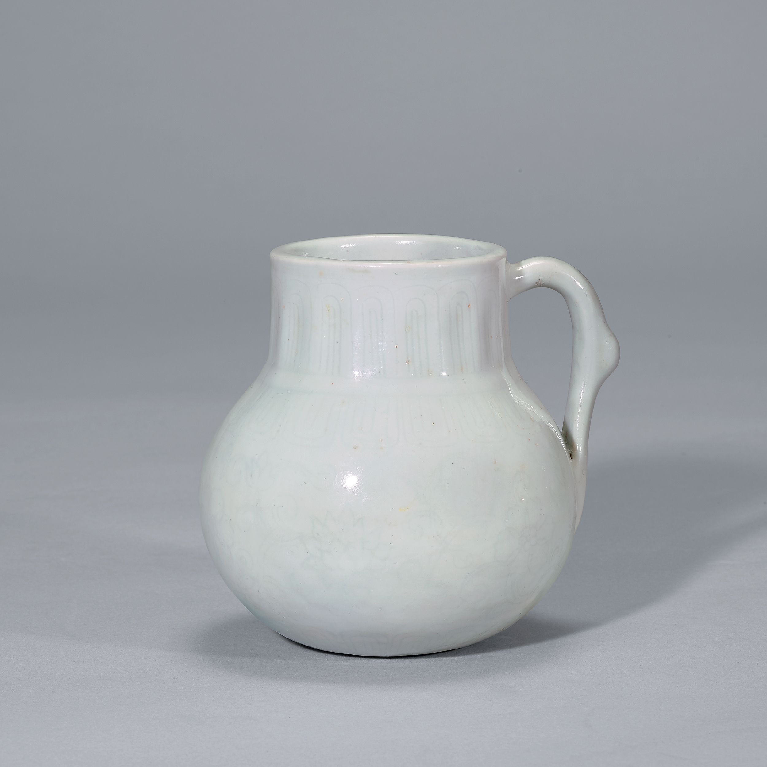 此器唇口,直頸,頸側飾有曲柄,溜肩,圓腹下垂,通體施白釉,釉色白如凝脂,樸拙素雅。頸部及肩部切削成多棱面,棱面上繪菊瓣紋,極富立體感。腹部暗刻纏枝花卉紋,花朵嬌柔可人。整器體態秀美,釉色潤澤,為明代白瓷之代表作。永宣兩朝製瓷器花澆,形制大同小異,此花澆以伊斯蘭金屬器為摹本燒造,獨具異國韻味。上海博物館藏有一件明宣德 青花唐草紋把手壺,其形制特點與本器極為相似,可以對比參考。
