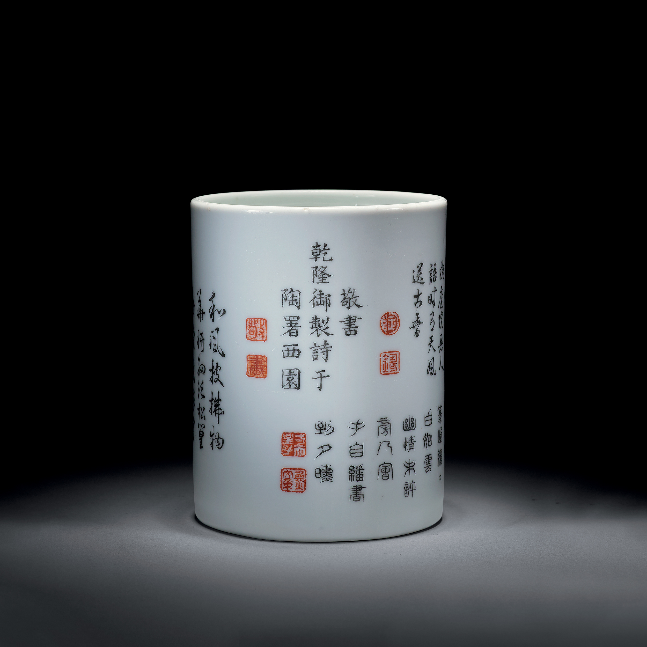 此筆筒直筒狀,淺圈足。通體白釉,施釉平滑,釉質清透滋潤,以墨彩書行,隸,篆等各式字體題寫乾隆帝禦製詩文四首,最後有“敬書 乾隆禦製詩于陶署西園”之落款,表明此筆筒為唐英敬題燒造。筆筒整體以詩文作裝飾,詩、書、印融爲一體,詩文行筆流暢,氣韻生動,筆法老到,灑脫之心情,浸透字裏行間,頗見功力,極富有濃郁的文人氣息,反映出唐英極高的藝術修養與造詣。筆筒雖小,卻是古代文人案頭必備之物。自晚明以後,瓷質文房用品逐漸進入文人視野,它與紙、筆、墨、硯等一起成爲他們珍賞的文房雅具。唐英在督陶之時,曾親自設計制作了一批瓷質文房用具以自用,這批瓷質文房兼備了唐英的文人巧思和高超制瓷技藝,成爲了極具品位的藝術珍品,本器便為其一,流傳數百年,極為難得。