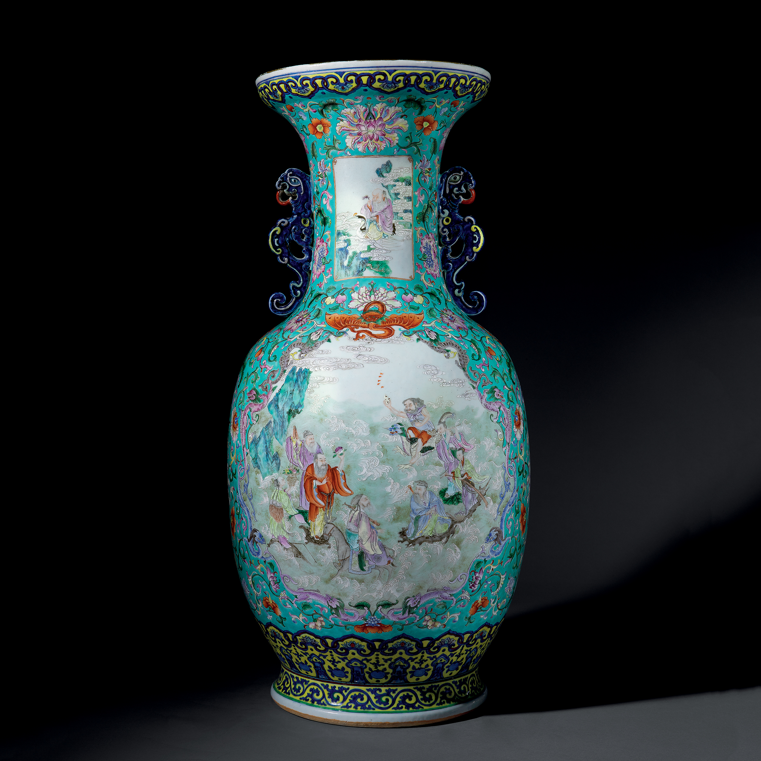 此瓶撇口,溜肩,腹部近底稍斂,下承外撇圈足,頸部兩側飾鳳耳。瓶內外均以松石綠為地,口沿描金,口沿及近足部均以黃釉繪如意紋一周,足墻飾唐草紋一周。瓶身通體以粉彩繪纏枝西番蓮紋,頸部開光繪東方朔和壽星圖案,腹部則以龍紋,蝠紋圍成開光樣式,內繪八仙祝壽場景,仙山樓閣,祥雲繚繞,仙鶴翱翔期間,生動的表現了宮闕仙境。底部落“大清乾隆年製”六字篆書款。