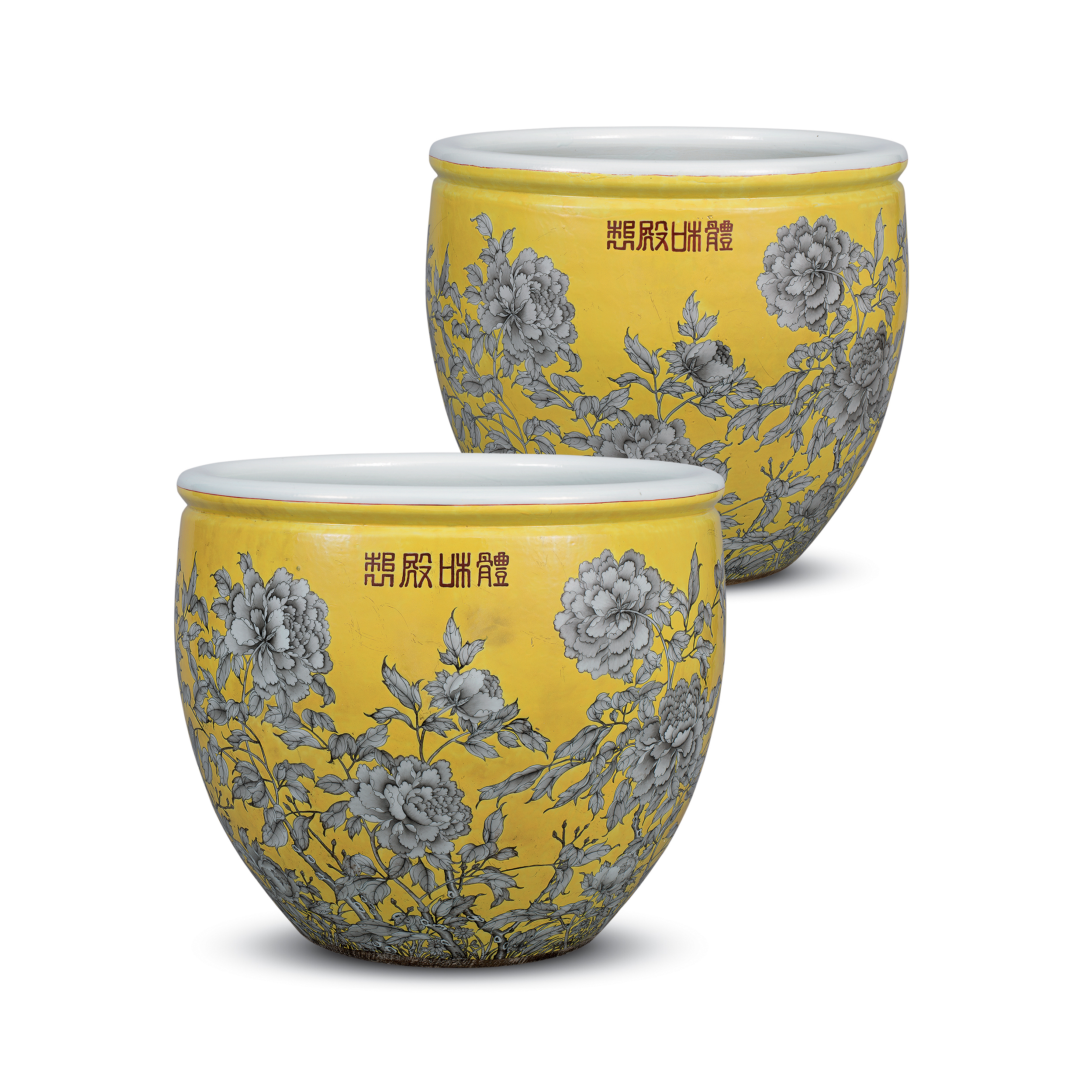 此對黃地墨彩滿堂富貴牡丹紋缸,唇口弧腹,平底露胎,器形碩大,成對保存,實屬罕見。口沿處礬紅彩書“體和殿制”篆書橫款。器身以黃釉爲地,通繪纏枝牡丹紋,花團錦簇,寓意“滿堂富貴”。其構圖張弛有度,濃淡相宜。牡丹朵朵嬌媚,競相怒放,一派雍容氣象,盡收眼底。以墨彩爲之,更添幾分清雅。