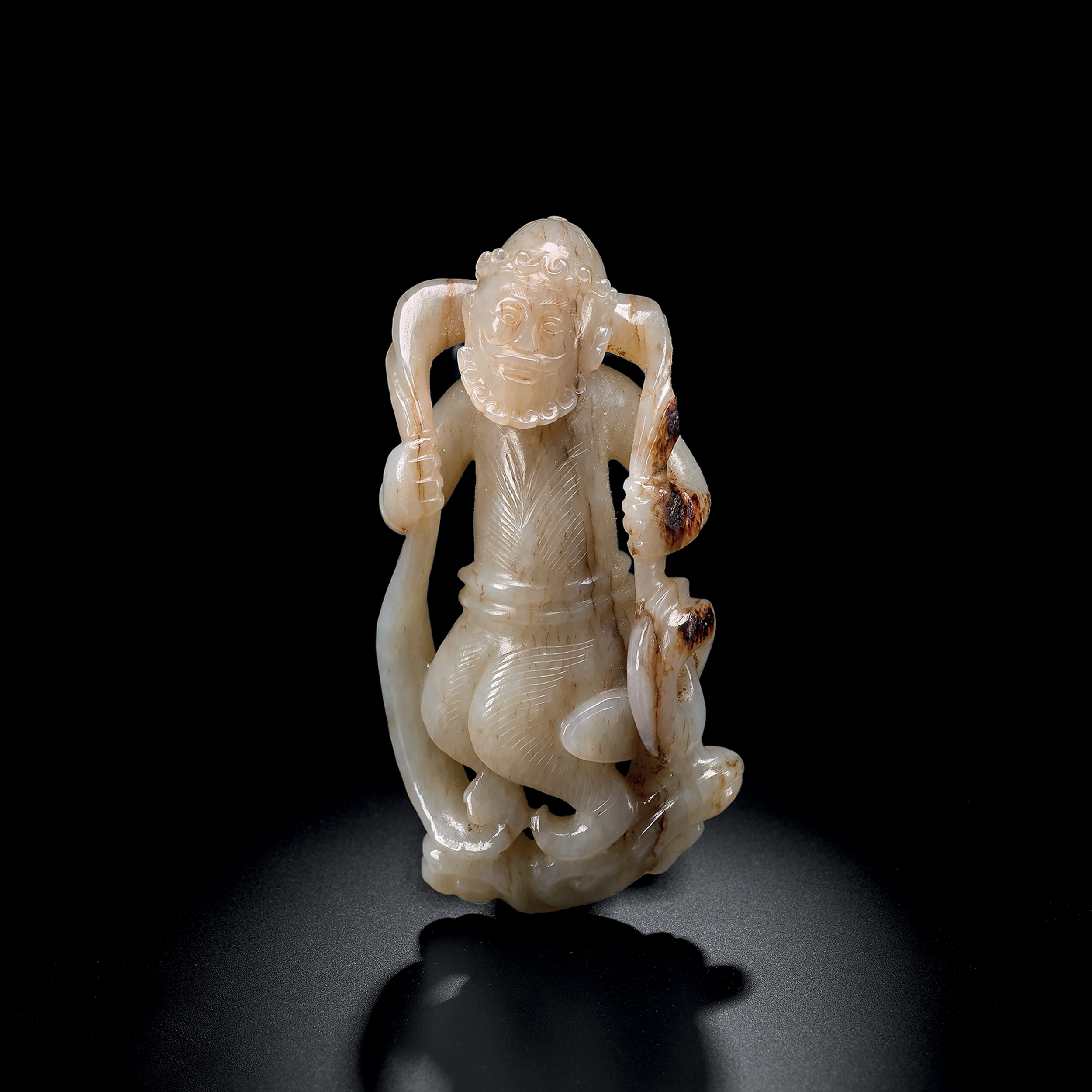 本次春拍,一批珍貴少見的明清玉雕與廣大藏家見面,其中有台灣清翫雅集會員的舊藏,也有日本及香港等地著名收藏家的舊藏雅玩,玉質之優,雕刻工藝之精湛,極為少見。例如其中的 清乾隆 白玉麒麟馱書擺件,玉質溫潤如脂,毫無一瑕疵,全器用圓雕的技法雕刻盤臥之麒麟瑞獸,麒麟口啣捆綁著書冊的絲帶,雙眼遠眺,傳神至極,器物整體構思奇巧,雕刻刀法細膩,比例適當,當是清代乾隆朝之物無疑。另一件明 御製青玉螭龍紐璽,玉質柔潤,鈕雕精美,尤其是其小小的印面,竟然陽文雕刻杜甫作的《秋興八首》全文,共計448字,文字字形周正,匠心獨到,實為難得的玉雕印璽精品。還有一件清乾隆白玉帶皮雕赤壁夜遊山子,此山子為子玉整掉而成,玉質潔白潤澤,刻者隨石紋巧雕作蘇東坡赤壁夜遊圖紋,整器器型之碩大,雕刻工藝之精絕,堪為典型的乾隆朝玉雕器物,殊為難得少見。還有數件精品,詳見內文,此處不做過多說明。
