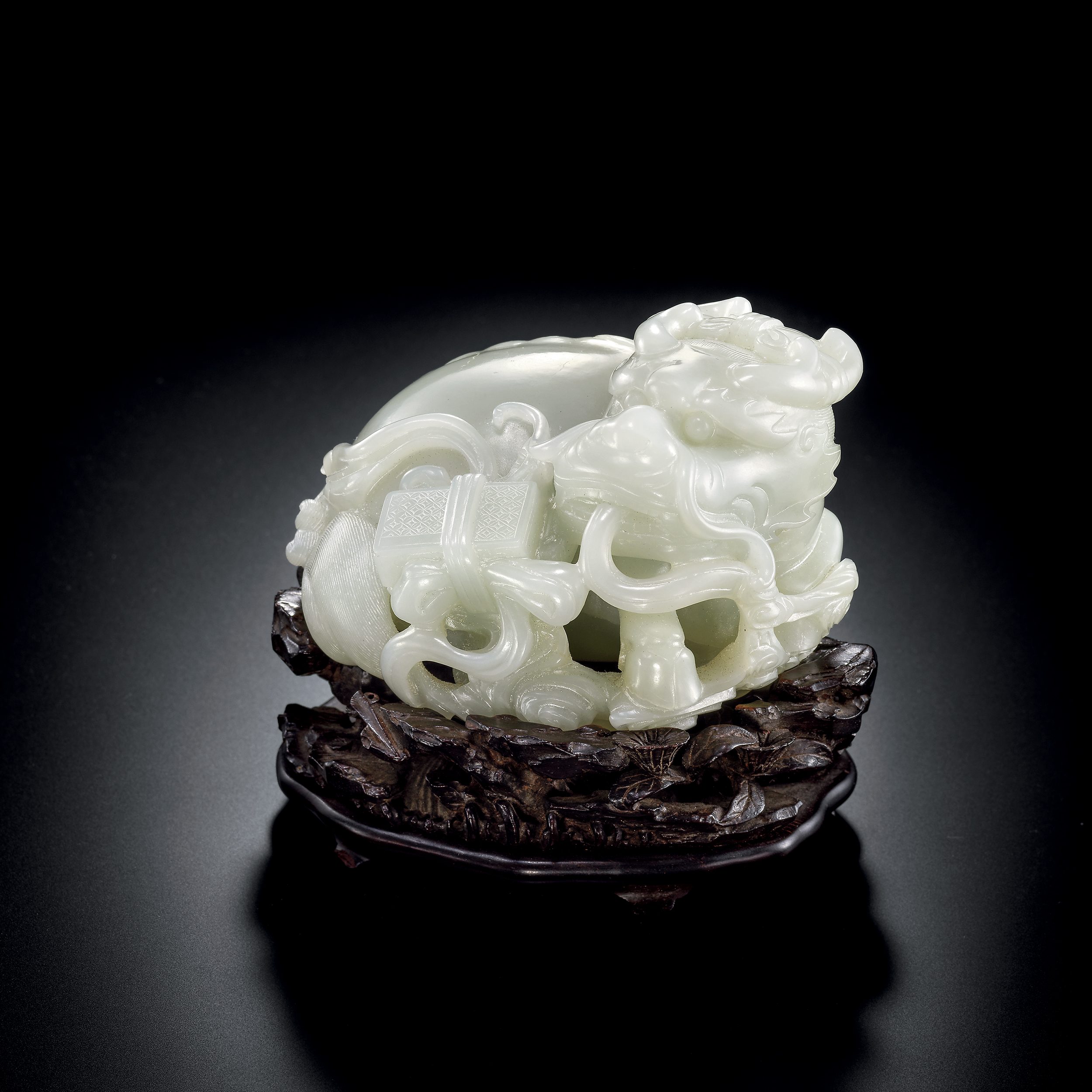 麒麟負書最早演化出自“河出圖,洛出書”的典故。後有晉王嘉曾在《拾遺記》中記載,孔子誕生前,有麒麟吐玉書於闕里,孔母知其乃祥瑞之兆,便以繡衣系麟角。孔子出生后,人們便稱他為“麒麟兒”。麒麟的出現,象征當世君主有德,其“有王者則至,無王者則不至”,而“王者至仁則書”。故麒麟負書對文人來說乃是祥瑞之象征,也象征著古人天人合一之理念。整器造型細緻穩重,雕刻精美、技藝精湛、乃案頭清供之品。2013年香港佳士春拍 LOT2186 清乾隆 青玉器靈馱書擺件與本拍品雕刻風格極為相似,以茲參考。