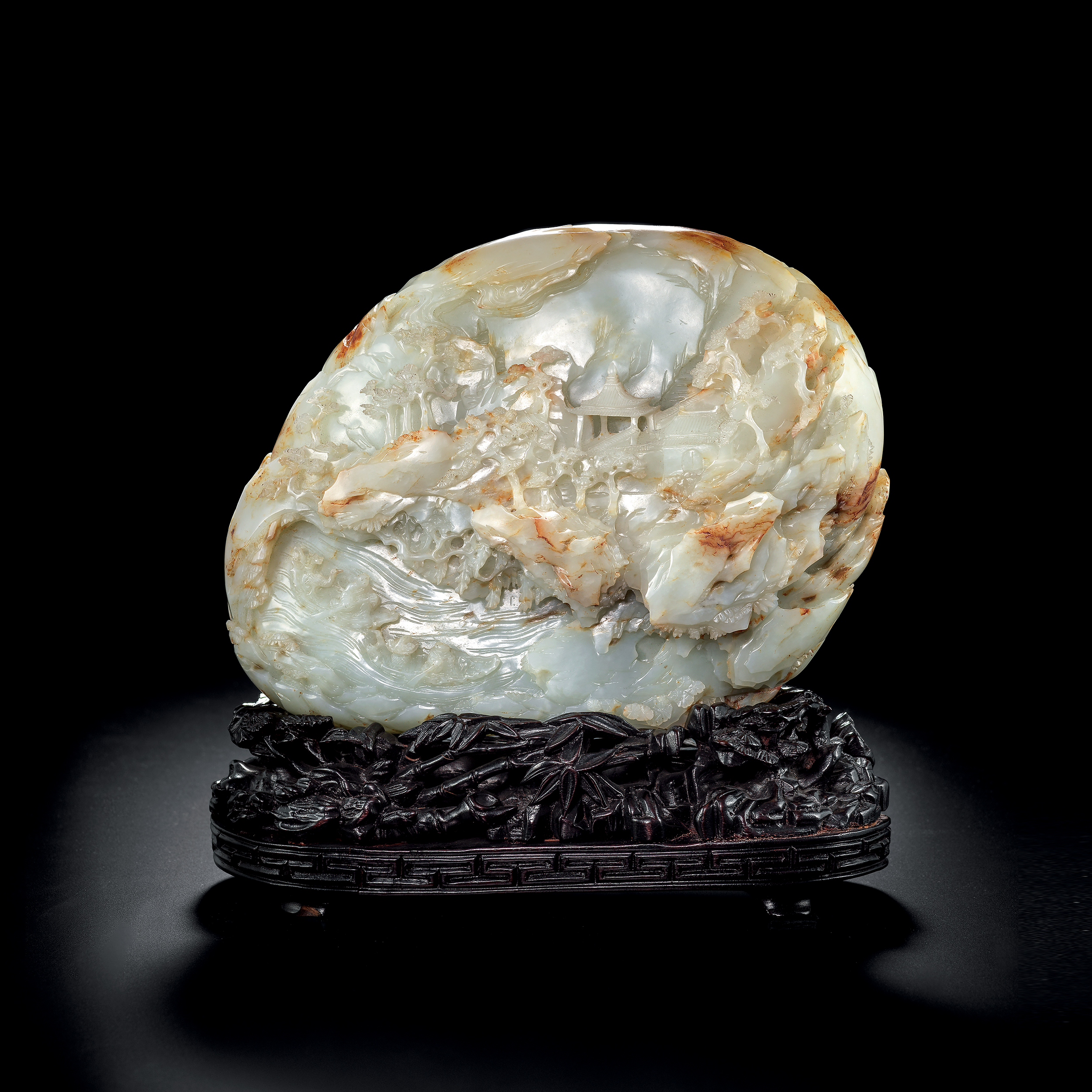此山子用料奢華,加之整幅構圖疏密有致,極富層次感,雕刻工藝高超非凡,雄健幹練,剛柔並濟,以小見大,方寸間盡顯上水人物之風流。乾隆朝玉料豐富,且乾隆帝嗜玉如命,不惜工本製作各類玉雕精品供其賞玩,此件山子做工精美,下承鏤雕松竹紋器座,製作考究,當為宮廷之舊物,可寶可藏。