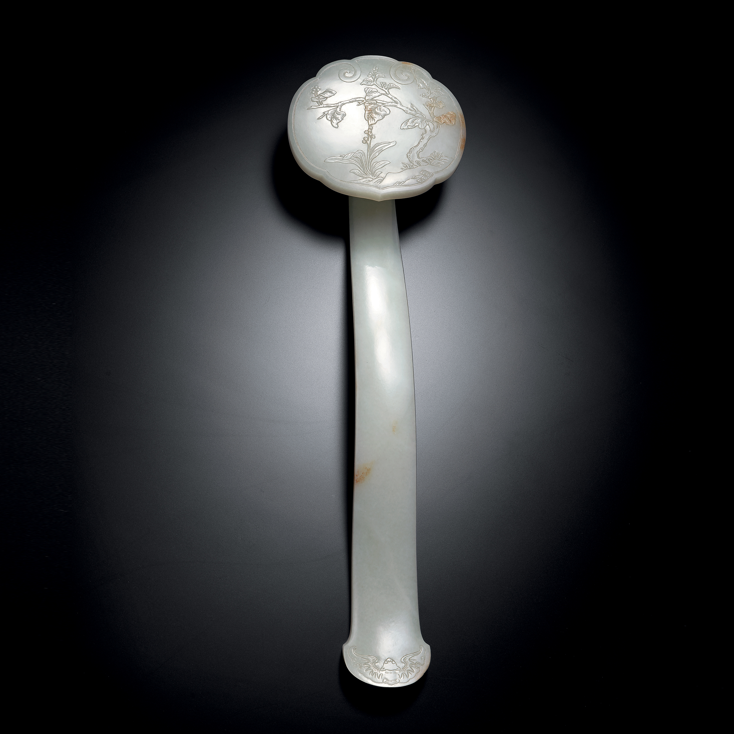 此件如意以整塊白玉雕琢而成,玉質潔白溫潤,晶瑩剔透。如意呈靈芝狀,云葉首,四周起如意雲紋邊框,首面隆起,中間浮雕花卉紋,樹幹堅實,枝葉繁茂,脈絡刻畫清晰。如意柄中央素面光潔,未飾任何花紋,更顯玉質光潔細膩,末端雕一蝙蝠紋,寓意富貴吉祥,也展現了清代宮廷審美,圖必有意,意必吉祥的用意。