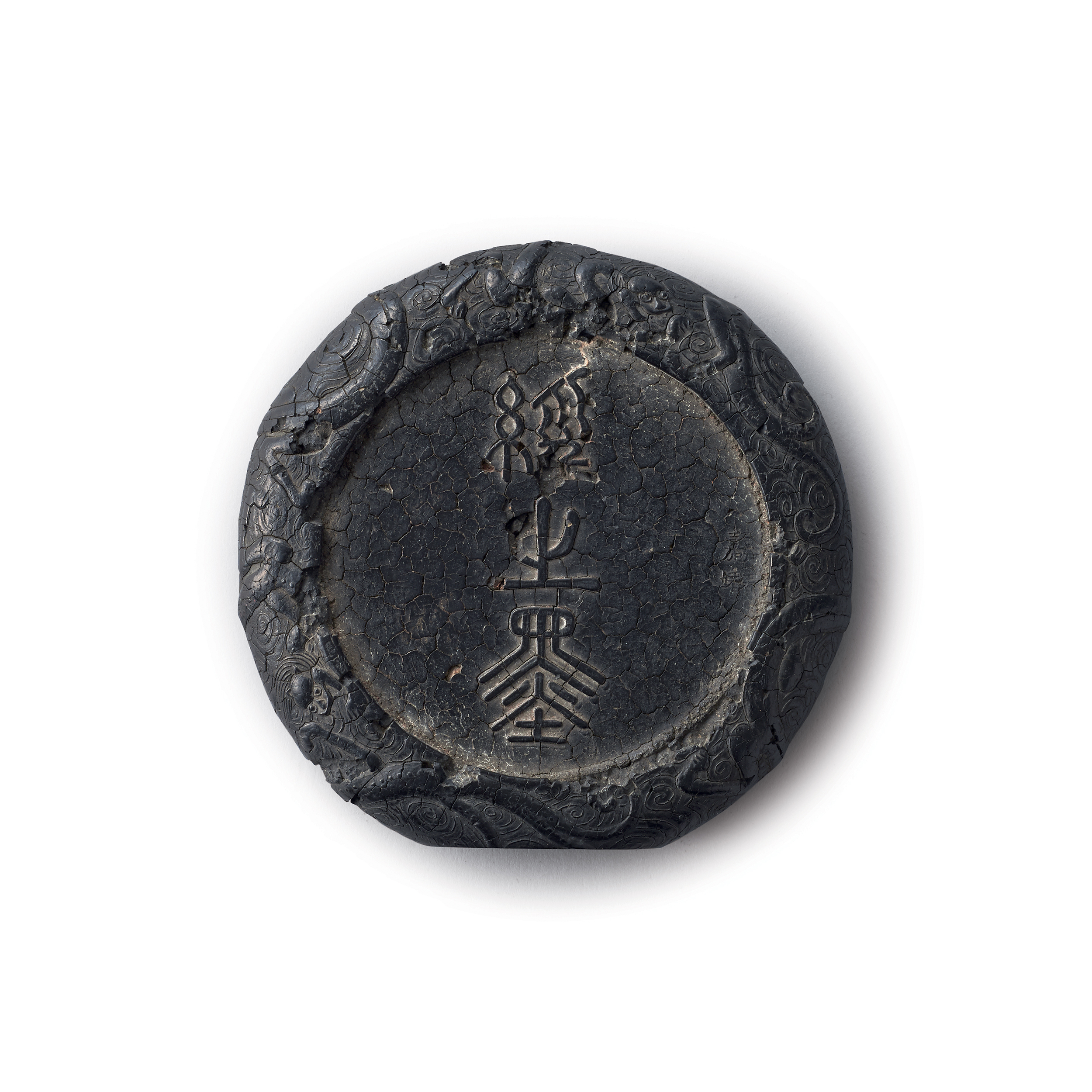 墨作圓形,四周浮雕龍紋,中間篆書陽文“經之墨”,右側“嘉靖”二字款,背面作團龍紋。此墨稍磨,磨口細膩剛亮,質地縝密,整體紋飾精細如初,古樸雅緻。此墨無名款,根據今人穆孝天《安徽文房四寶史》的考證,確定爲汪中山的作品。由墨表形態看,此墨曾經漆衣刮磨加工法。作法是“磋以锉,摩以木賊,繼以蠟帚,潤以漆,襲以香藥,其潤欲滴,其光可鑒。”漆衣墨年代越遠,漆皮越顯渾厚,並呈現蛇皮式龜裂紋,又似古瓷開片。漆衣墨明晚期盛極一時。從此墨外表肌理,也可證之爲明代古墨。
