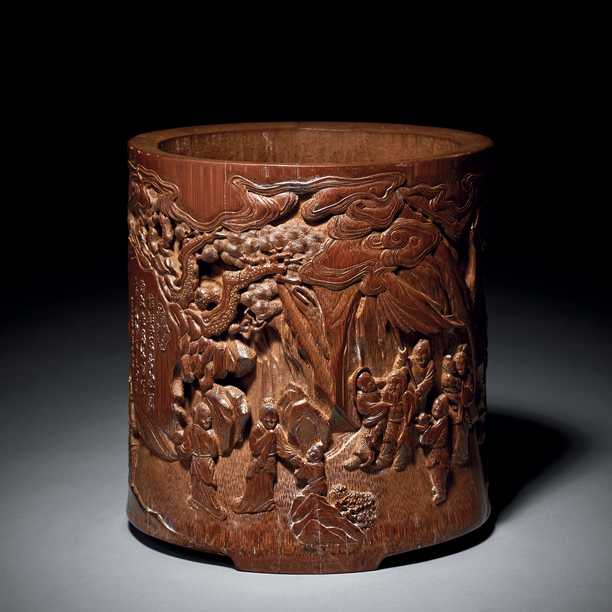 吳之璠,字魯珍,號東海道人,清初至乾隆竹刻四大名家之一,被近代竹刻名家金西厓譽為朱稚征之後之“嘉定第一名手”,可謂推崇備至。吳之璠因擅長繪畫,故紋飾內容方面常常以故事描述的畫面作為題材。同時,他亦擅長書法,故所刻詩文不論陰文,陽文均游刃有餘,極見功力,而且他以自己的詩文入稿,實可謂獨樹一幟。吳之璠傳世之作品不少,如台北故宮所藏的吳之璠黃楊木雕東山報捷圖筆筒,材質雖為黃楊,但運用竹雕技法,將常見的東山報捷圖雕飾的波瀾壯闊,氣韻非凡,就連清高宗見後都讚不絕口,成為傳世的經典之作。本件竹雕文姬歸漢筆筒,雕刻之精細,構圖之複雜,均可與其比對,以茲參考。