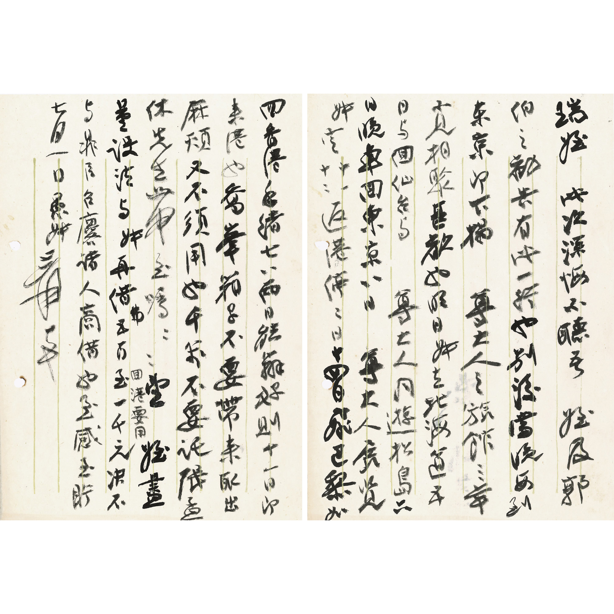 釋  文:瑞姪:此次深悔不聽吾姪及郭伯之勸告,有此一行也,別後當晚。每到東京即下榻尊大人之旅館,三年不見相聚甚歡也。明日叔去北海道五日與回仙台,與尊大人同遊松島六日,晚車回東京。八日,尊大人展覽,叔定十一、十二返港,停二日,十四日飛巴黎,如回香港手續七八,兩日能辦好,則十一日即來港也。喬峰箱子不要帶來,取出麻煩又不須用也,千萬不要託張孟休先生帶,至囑。望姪盡快設法與叔再借五百至一千元(回港要用)決不與鼎臣、召麐諸人商借也。至感至盼,七月一日,愚叔,爰,頓首。