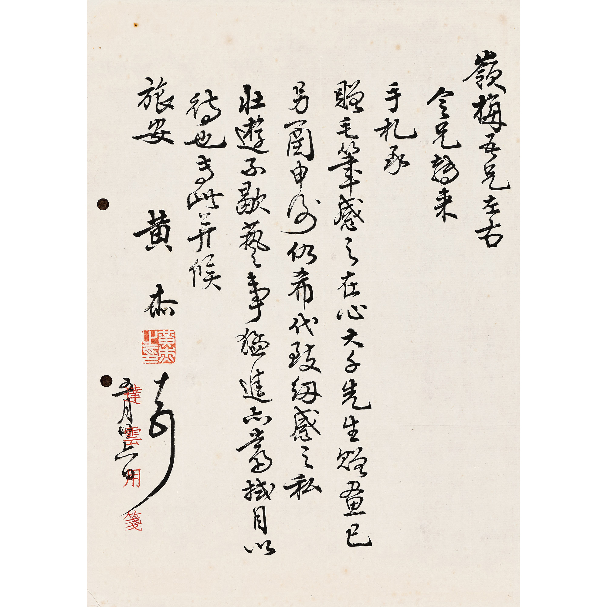 釋 文:嶺梅吾兄左右:令兄轉來手札,承贈毛筆,感之在心,大千先生贈畫已另函申謝,仍希代致紉感之私,壯游不歇,藝事猛進,亦當拭目以待也,專此并候旅安,黃傑頓首。五月廿六日。鈐 印:黃杰之印(白)來 源:「梅雲堂」家族珍藏中國書畫。作者簡介:黃杰 字達雲,湖南長沙人,生於清光緒二十八年十一月二日。湖南省立長沙中學畢業。中華民國陸軍一級上將。獲頒青天白日勳章、雲麾勳章等。