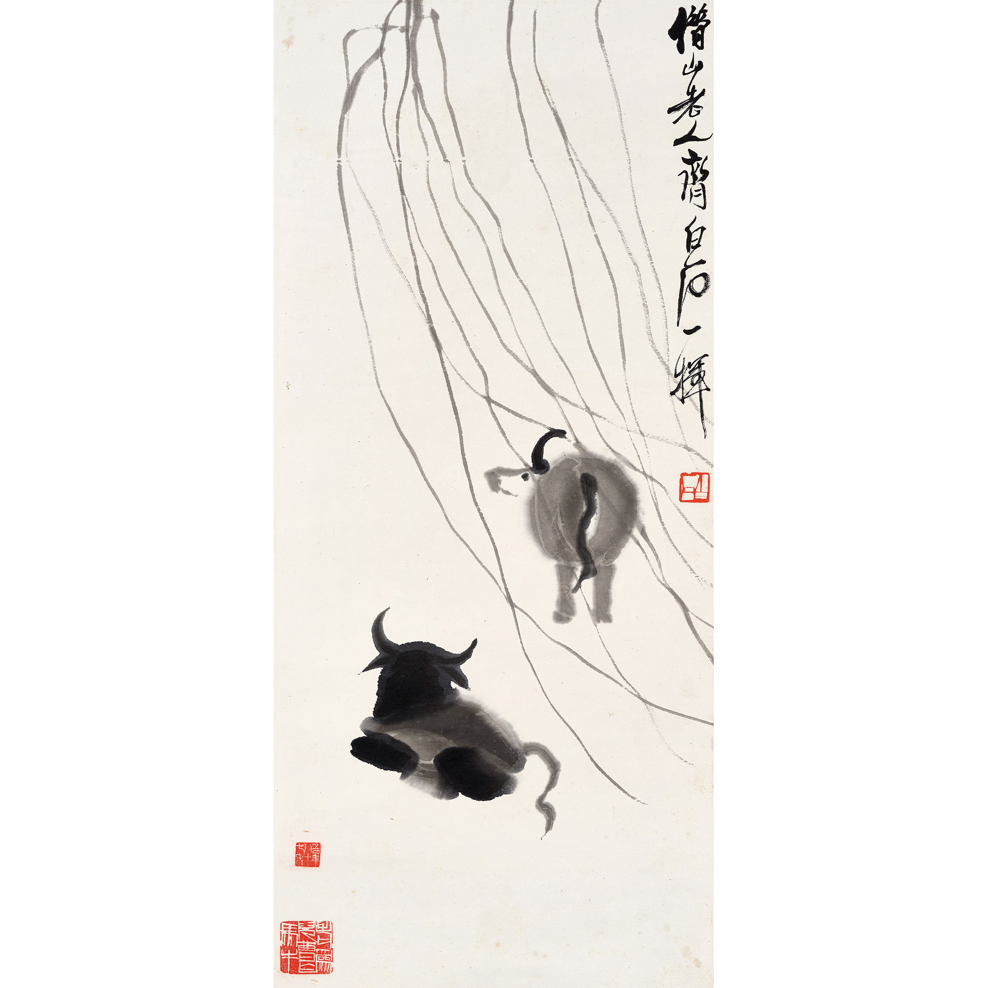 說 明:齊白石堪稱一代大師,一則因其獨處新處,一掃舊習;二則因其影響廣泛,空前絕後。論齊白石能獨處新出,正如其自己所謂“膽敢獨造”,藝術之所謂出新者,必以繼承而後出新。歷代畫牛者,不計其數,造型千姿百態,風格各異。齊白石畫牛,則是一反常態,全牛不畫,唯獨畫牛屁股,有道是“老虎屁股摸不得”,牛屁股也不能亂拍。而此幅《柳牛圖》的絕妙之處,正是為人之不為,為人之不敢為,幽默風趣的題材,令人莞爾之餘,其敢於開創的精神,亦讓人欽佩。此作不僅角度刁鑽,充滿閒情逸致,筆墨更是奇佳,柳條行雲流水,信手拈來。墨牛凝重渾厚,寥寥數筆,形態俱出。柳條輕快,墨牛穩重,二者於畫面上形成鮮明對比。正如落款“一揮”,即是不計工拙,出於自然而又不失古法,可謂妙哉。