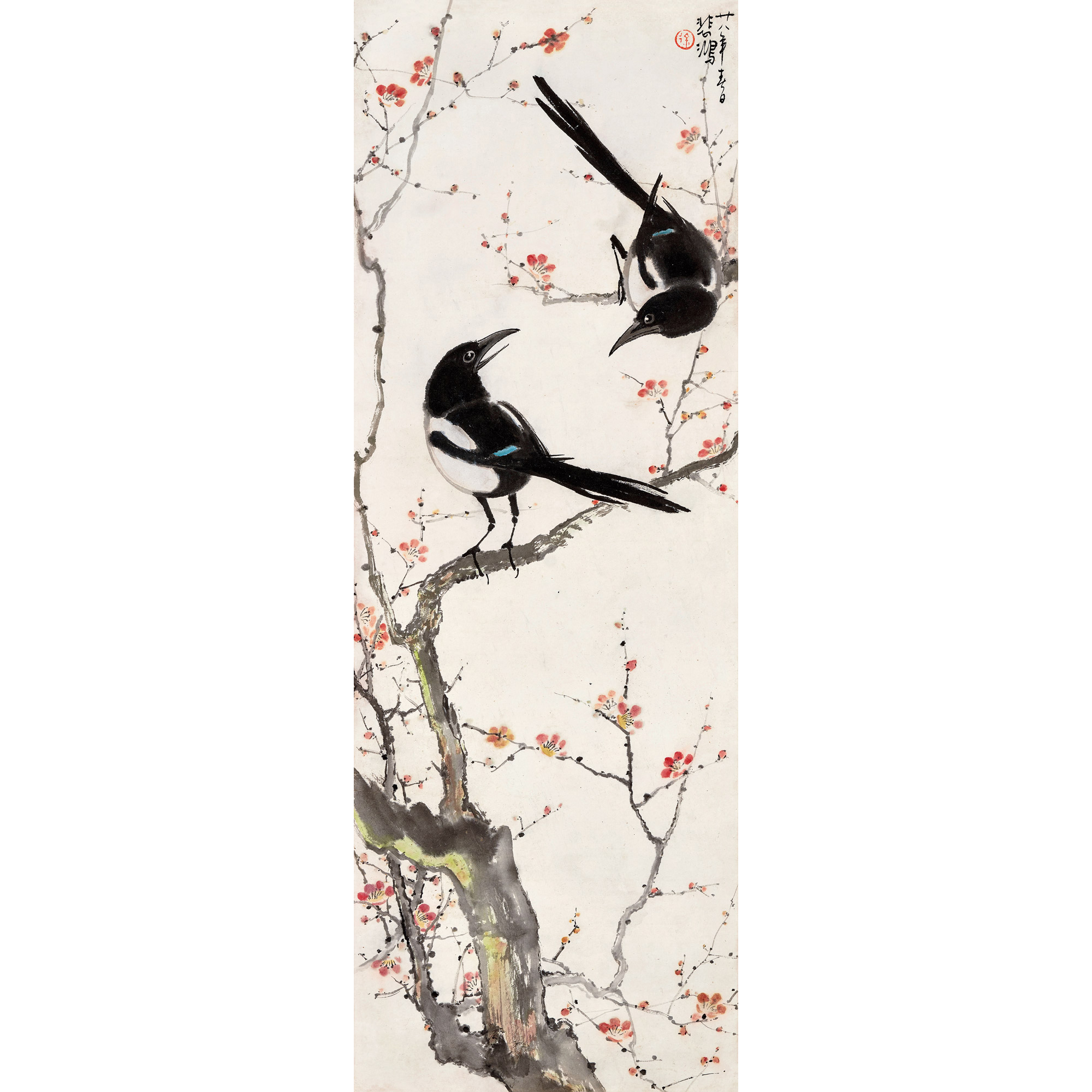 說  明:此幅《雙喜圖》作於民國廿八(1939)年春,以兩隻喜鵲躍上紅梅枝頭寓意喜上眉梢,表達了藝術家對新一年的憧憬。仔細觀察喜鵲,以粗筆濕墨勾寫,部分軀用淡墨渲染,表現出圓渾質感的同時,亦投射出明暗光感,鵲身局部還施白,立體效果頓顯。徐悲鴻一生致力將中國傳統繪畫註入西方繪畫元素,註重造型與光影的處理,強調描繪對象結構的解剖、乃至骨骼的準確把握,此作可謂其「以西潤中」之典範佳作。
