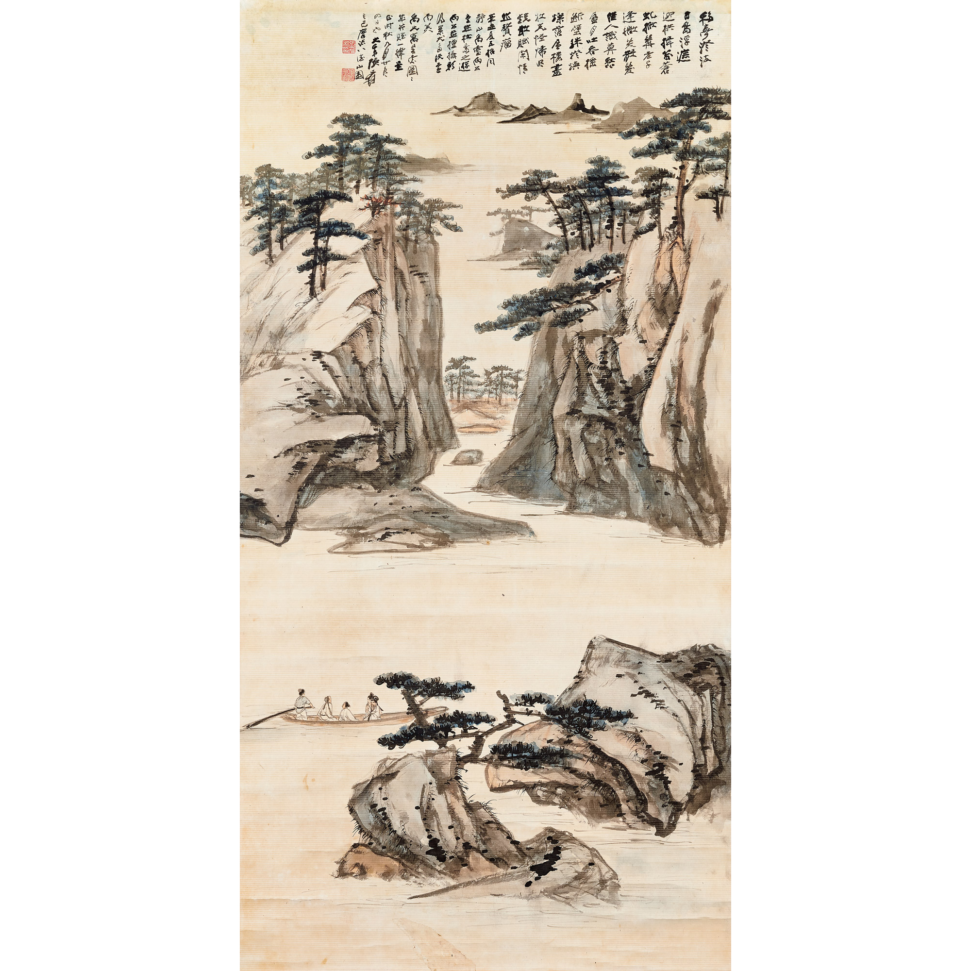 說 明:本軸繪於六十年代初期,取巨幅羅紋紙繪製,松繪細膩淺絳設色淡雅,是研究大千轉型期的重要作品。此時正值張大千輾轉巴西、美國、東京、歐洲間,這個時期展覽應接不暇,也為大千接觸世界不同文化提供了一個契機,更是其畫風演變的一個重要過程。