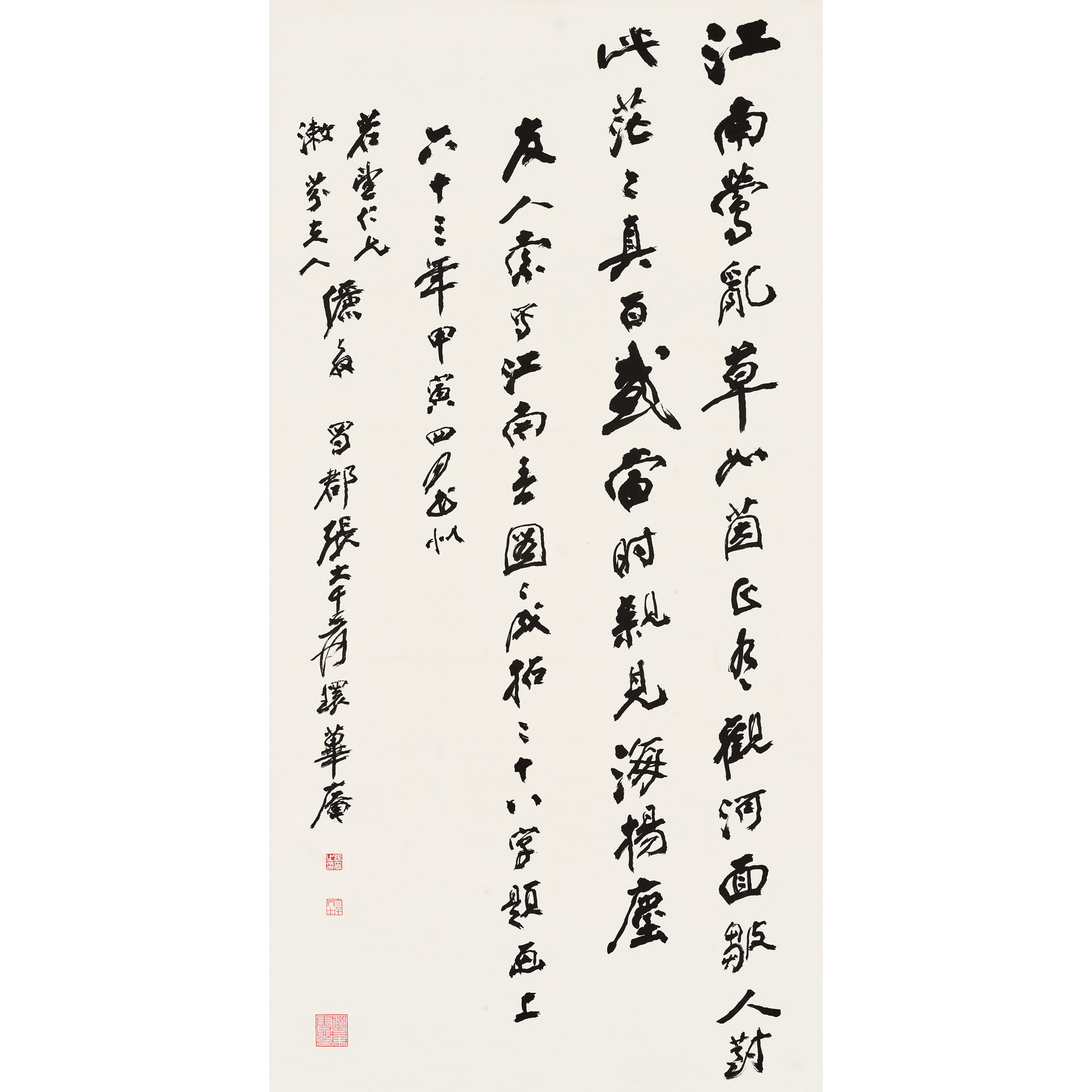 款 識:友人索寫江南春圖,圖成拈二十八字題畫上,六十三年甲寅四月,書似若望仁兄、漱芬夫人儷教,蜀郡張大千爰環蓽庵。