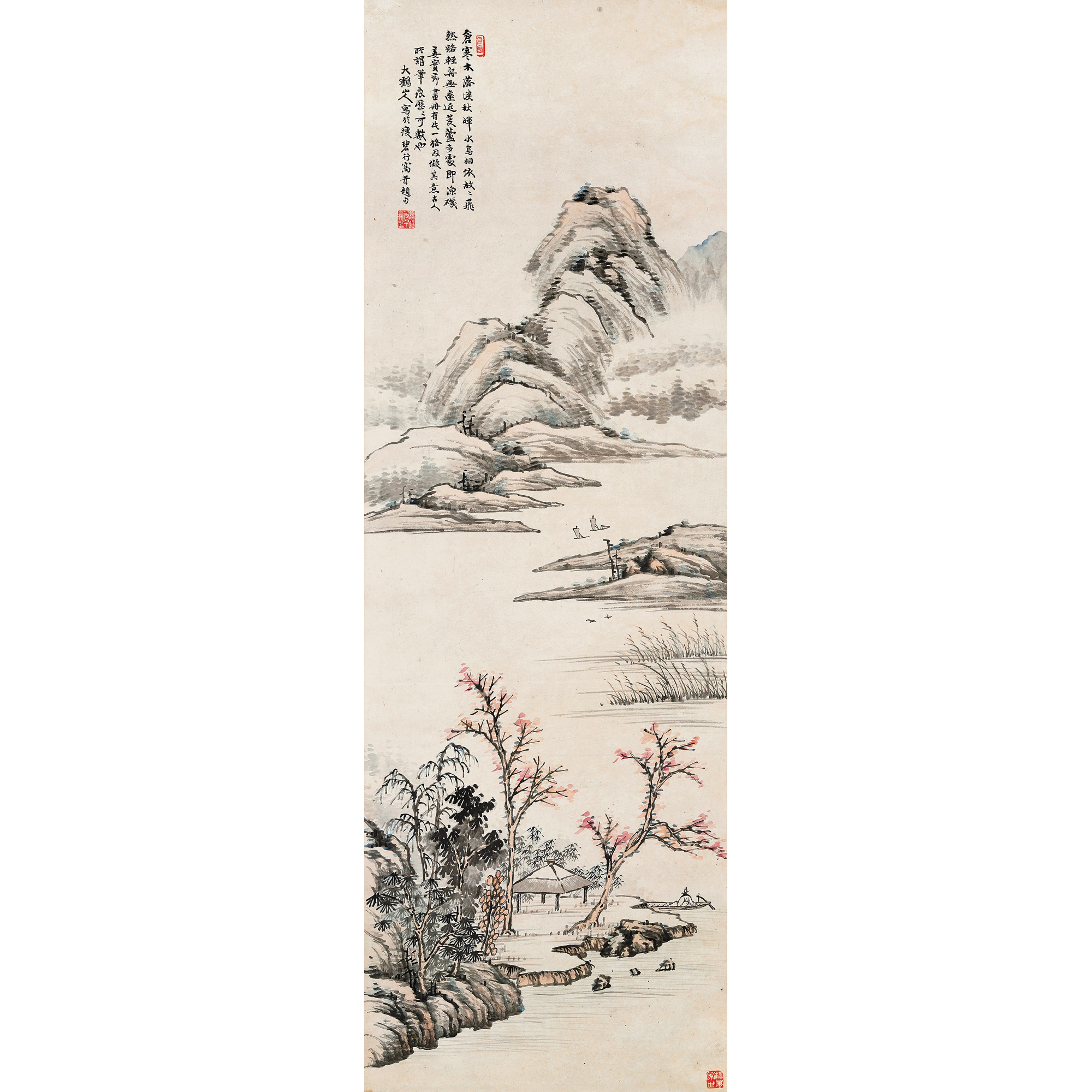 款 識:蒼寒木落淡秋暉,水鳥相依故故飛,熟路輕舟無遠近,芰蘆多處即漁磯。姜實節畫冊有此一格,因擬其意,古人所謂筆痕歷歷可數也。大鶴山人寫於瘦碧行窩并題句。