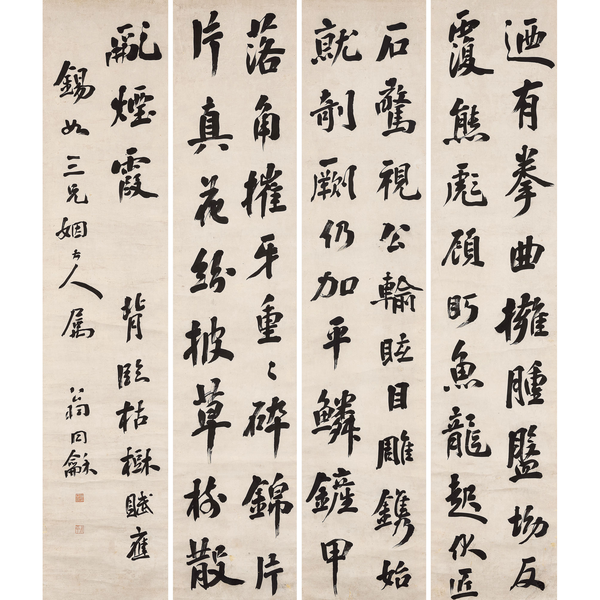 釋 文:《枯樹賦》(節錄)。來 源:「蠖隱小榭」亞洲私人藏家同一收藏注:與《一期一會·聽茶聞香》lot741-lot748,《中國重要瓷器及藝術品》lot801-lot825,為同一來源。作者簡介:翁同龢 字叔平,號松禪,別署均齋、瓶笙、松禪、瓶廬居士、並眉居士等,別號天放閒人,晚號瓶庵居士。咸豐六年(1856)進士。官至協辦大學士,戶部尚書,參機務。光緒戊戌政變,罷官歸里。中國近代史上著名政治家、書法藝術家。