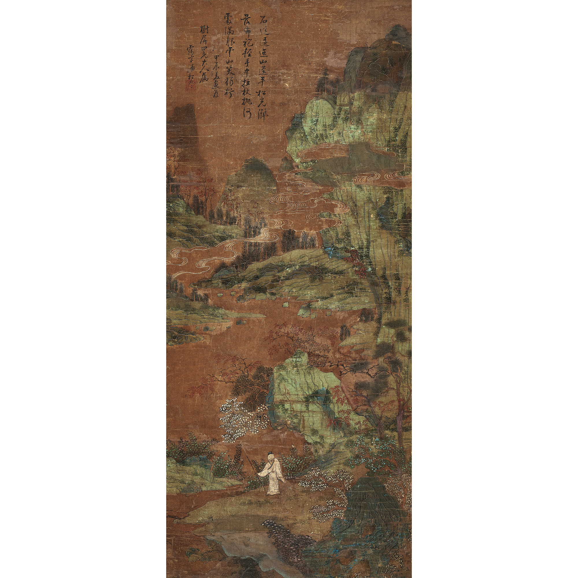 款 識:石徑逶迤山徑平,松光灑落布袍輕,手中拄杖拋何處,滿眼雲山笑獨行。甲辰夏畫,為樹屏四兄大人屬,靄齋潘和風。