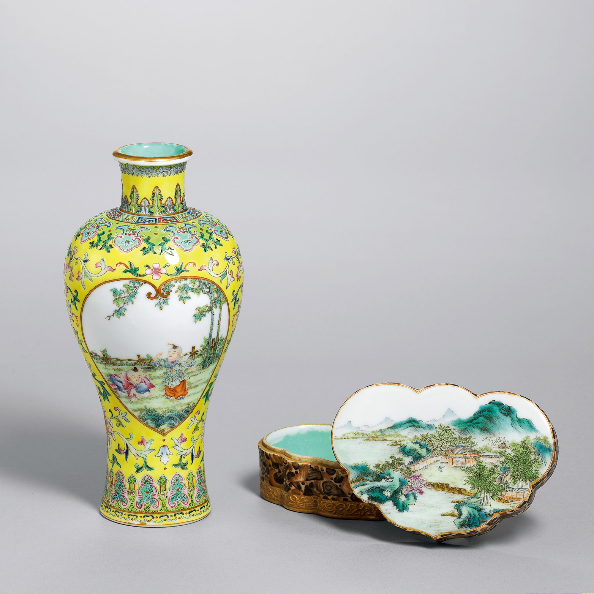 黃地粉彩開光嬰戲瓶 粉彩山水圖紋如意盒