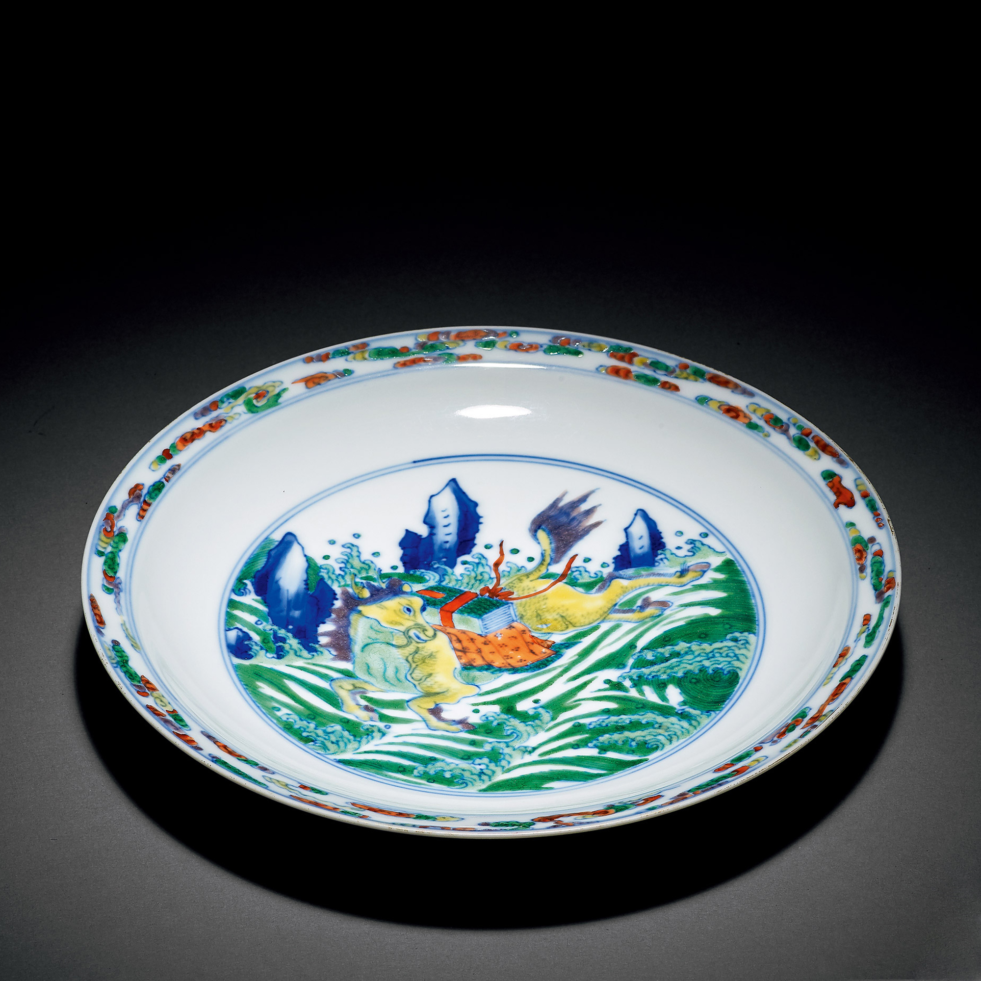 以物寄古,以古喻今是清代官窯瓷器的一大特色,本器以“龍馬負書”寄託盛世祥瑞,紋飾精美,釉色鮮艷奪目,堪為雍正官窯之傳世珍品,流傳數百年且品相完好,極為難得。舊鴻禧美術館藏有清雍正 鬥彩海浪瑞獸盤,紋飾與風格與本器極為相似,另有北京故宮博物院藏同款盤雍正款鬥彩海水異獸紋盤;香港佳士得2011年春拍lot 3528清雍正 鬥彩河圖洛書圖盤,亦與本拍品類似,以茲參考。