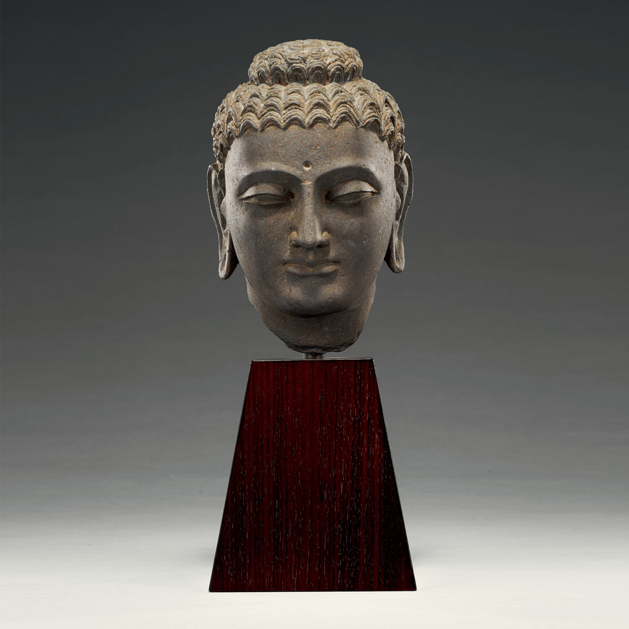 公元前1世紀的犍陀羅地區,濃郁的希臘羅馬藝術氛圍和貴霜王朝開放寬松的宗教政策,才使得犍陀羅地區的藝術家們能夠首先擺脫佛教各種戒律,徹底抛棄百年來的象征手法,造出了希臘化的佛像。此時的佛造像,在體貌特征上有很強的希臘血統,鼻梁高挺,雙目深陷,頭發卷曲呈水波狀,頭頂留一個大大的發髻。尤其對釋迦牟尼佛的形象塑造更顯如此。本釋迦牟尼佛頭像,線條明快,面容雕飾柔和卻又不失剛毅,便是這一特征的突出體現,是極為少見的早期犍陀羅藝術珍品,可寶可藏。