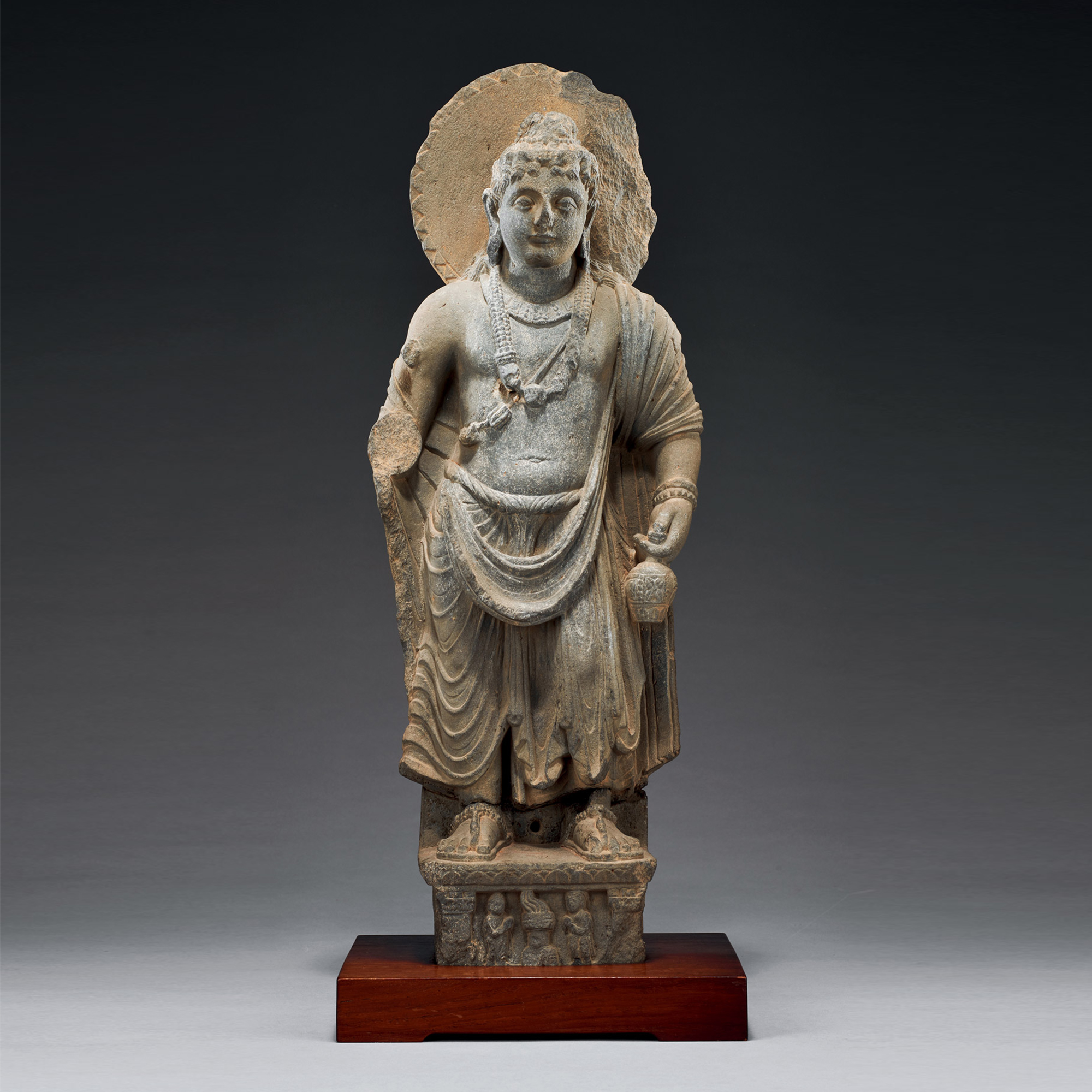 在犍陀羅的菩薩造像中,除了釋迦牟尼菩薩(未成道前)像以外,製作存世最多的應該就是彌勒菩薩像。佛經記載,彌勒佛將於佛陀涅槃後五十六億七千萬年後在此娑婆世界誕生,故被稱作“當來下生彌勒佛”,也叫“未來佛”,現居兜率天說法。由於彌勒菩薩為釋迦弟子,故犍陀羅之彌勒菩薩造像與釋迦牟尼佛一樣,均為古印度王侯貴族形象,而彌勒菩薩常結8字髮髻,手提水瓶這兩大特征,為區別於釋迦摩尼佛及其他犍陀羅人物的重要特征。古代婆羅門行者常持著水瓶,彌勒菩薩因其出身婆羅門,故特有此造形。婆羅門自稱是梵天的後裔,印度梵天圖像有四頭、四面、四臂的特征,其中一臂即持瓶。梵天與婆羅門行者所持之瓶,象征裝有甘露法水之不朽生命意義。水瓶亦是大乘佛教修行僧日常帶著的十八種隨身物之一。《八大菩薩曼荼羅經》雲:“想慈氏菩薩。金色身左手執軍持右手施無畏。冠中有窣堵波半跏坐。”可做爲犍陀羅彌勒菩薩持瓶的圖像與教理之依據。