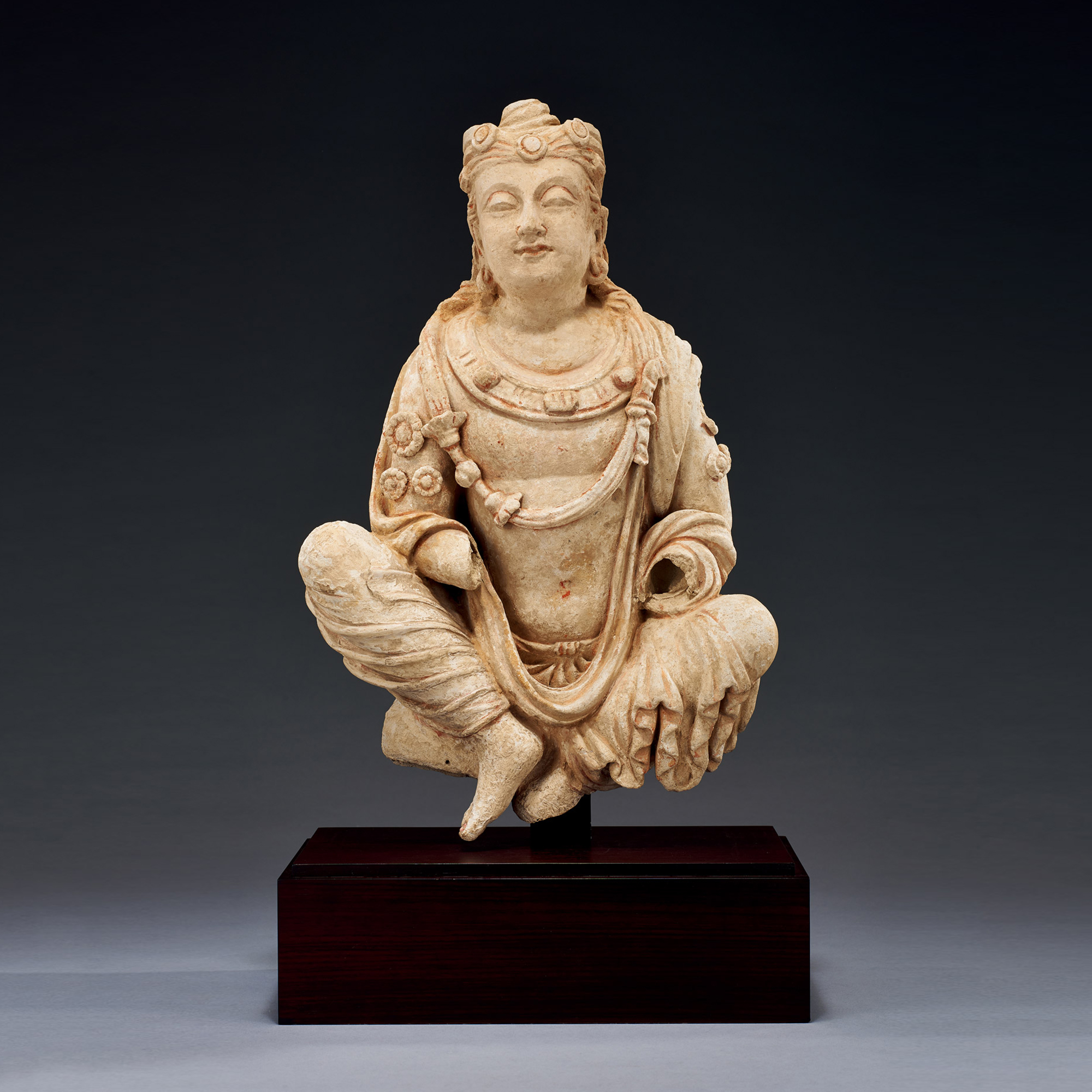 學術界一般認為交腳坐姿來至於波斯薩珊王朝的帝王造型。古代中亞王室貴族及上層社會眾人多採用這種坐姿,在中亞地區的石窟中,所見眾多交腳造像,亦包括彌勒菩薩交腳像。本造像體態優美健碩,尤其器面部表情,慈祥歡悅,一改犍陀羅嚴肅端莊之貌,令人耳目一新;雙腿相交似又未交,亦是本造像的一大特點。此像從現存狀態來看,器身施紅彩,部分區域仍有殘存,可見造像當初之美艷之態。